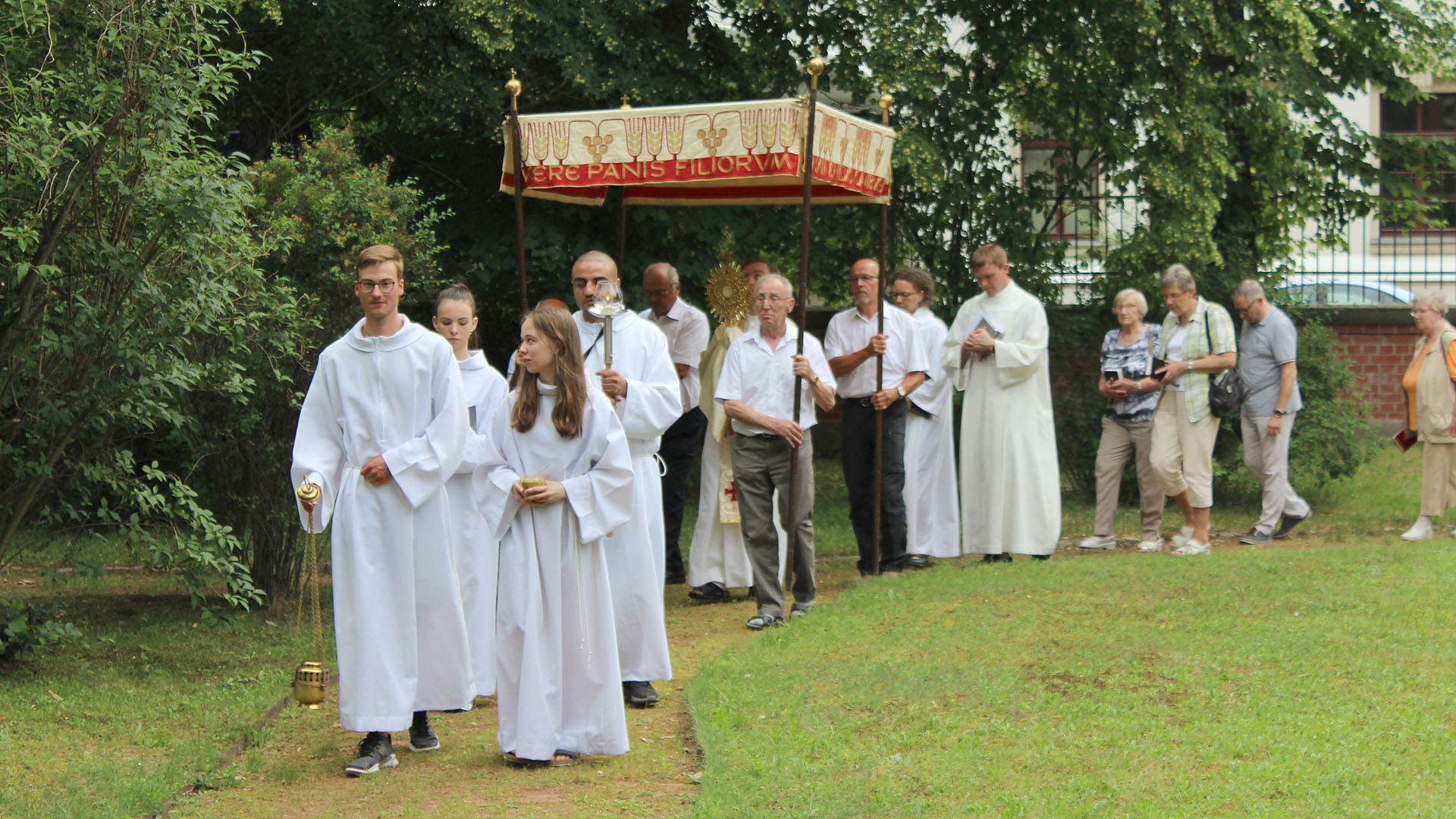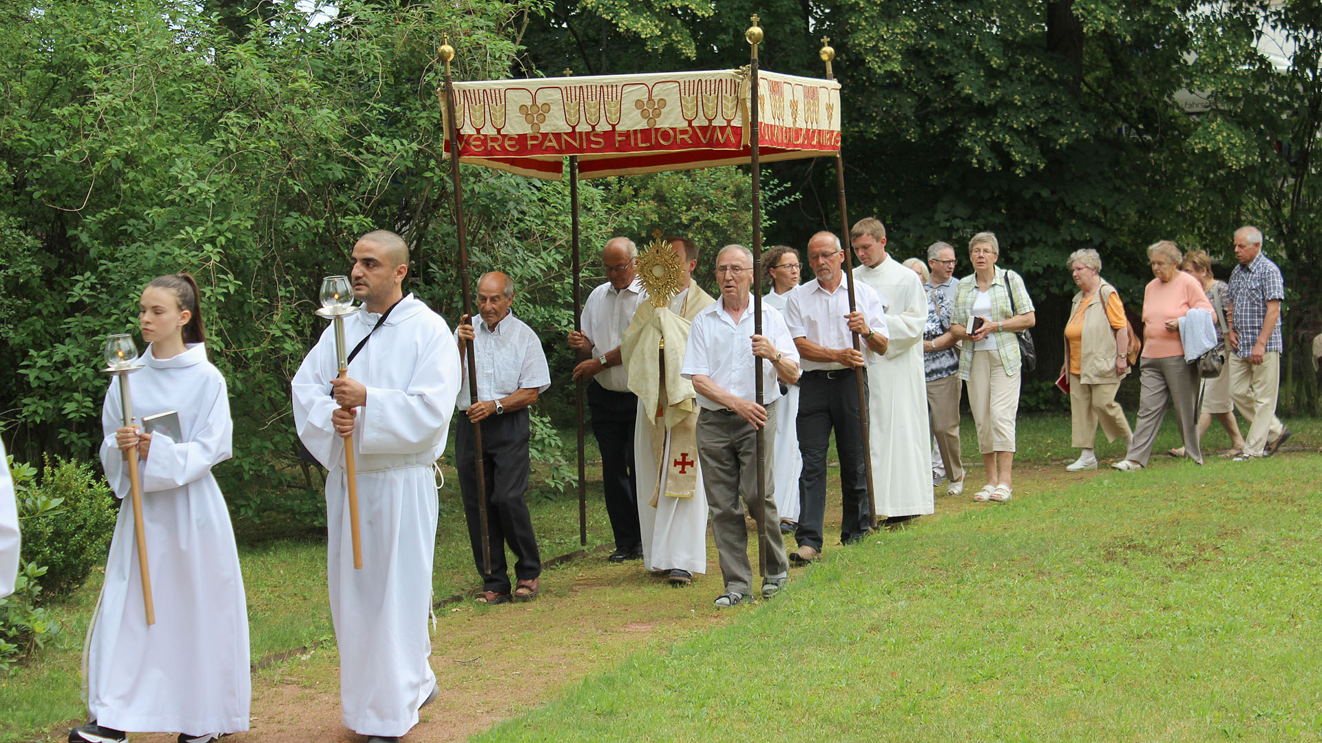 Borna (21.06.2019). Geschätzte 90 bis 100 Gemeindemitglieder und Gäste nahmen am Donnerstagabend, dem 20. Juni 2019, am Festgottesdienst und der Pozession zum Fronleichnamsfest in Borna teil.