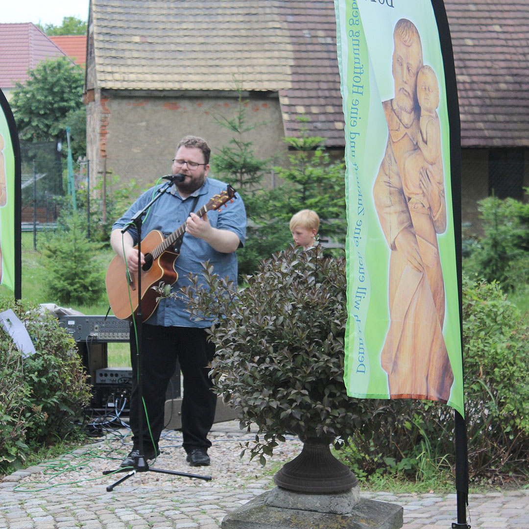 Im Anschluss blieben etwa zwei Drittel der Besucher zum Gemeindefest im Pfarrgarten. Sie genossen Leckeres vom Grill und Salat-Buffet, kühle Getränke und Live-Musik mit dem Leipziger Musiker, Sänger und Radiomoderator Daniel Heinze. Das sommerabendliche Wetter und die unterhaltsame Musik trugen ihr übriges zur guten Stimmung bei. Mit einem verliebten „Hallo“ verabschiedeten sie sich am Ende des Festes von ihrem Gast.