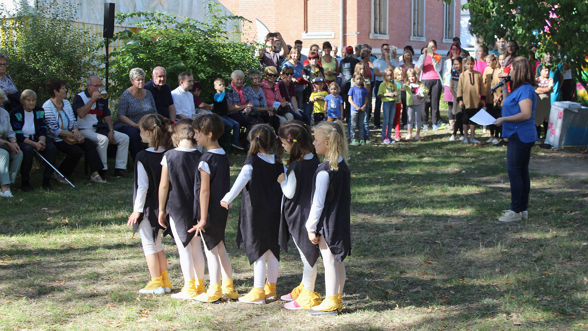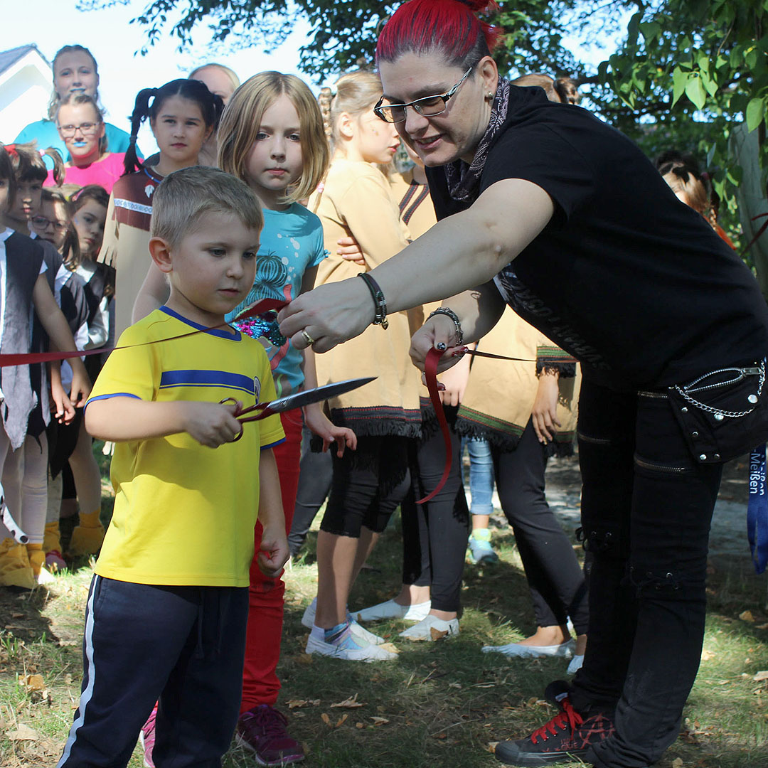 Kurz nach 14:00 Uhr begrüßte Pfarrer Dietrich Oettler die zahlreichen Gäste. Ebenso wurde der rundum erneuerte Kinderspielplatz im Pfarrgarten durch einen Scherenschnitt und eine Schildenthüllung eröffnet. Der Spielplatz entstand, neben professioneller Hilfe, auch durch fleißige Hände von Familien aus der Gemeinde und der Stadt. Er wurde vom Bistum Dresden-Meißen und der Sparkasse Leipzig gefördert und steht nun der Nachbarschaft mit offen.