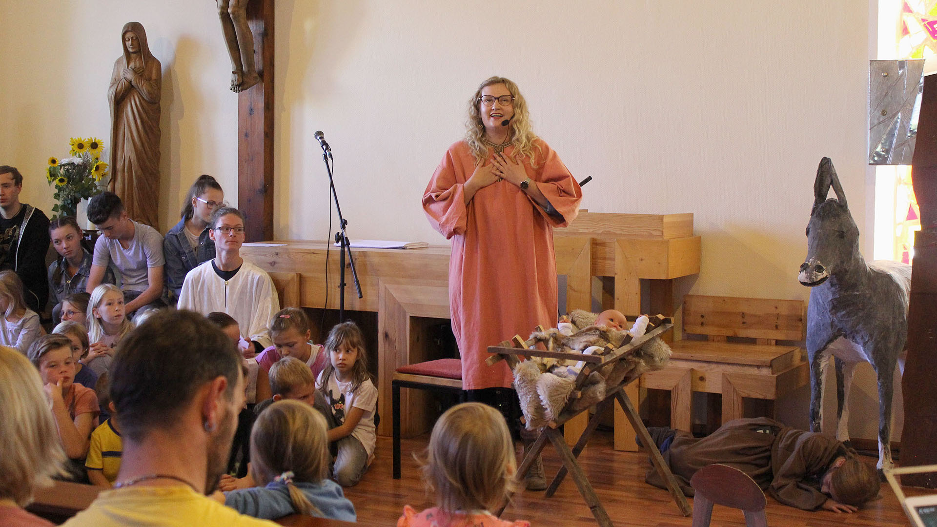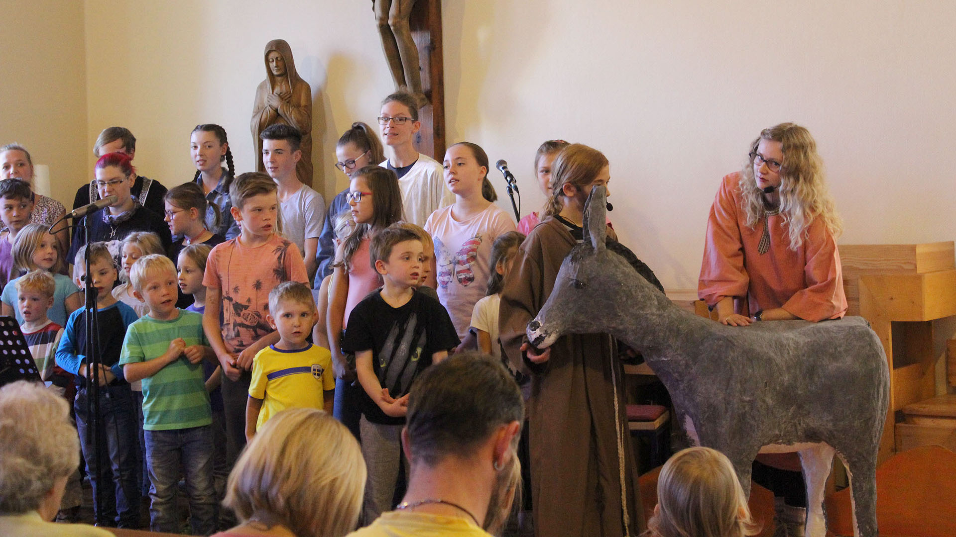 Weiter ging es im Programm in der Kirche. Der Kinderchor und die Profi-Musiker waren unter Leitung von Gemeindereferent Thomas Gömbi bereits startklar, als dem Erzähler des Kindermusicals auffiel, dass er seine Lesebrille vergessen hatte. Doch das Warten hatte sich für die vielen Zuhörer gelohnt. Für das Musical „Joseph und Maria – (fast) eine Liebesgeschichte“ wurde in der letzten Sommerferienwoche fleißig geprobt. Es hatte an diesem Nachmittag mit tollen Sologesängen der beiden Hauptdarsteller, Chorliedern zum Mitsingen, einer spannenden Erzählung und am Ende viel Beifall vom Publikum einen erfolgreichen Auftritt.
