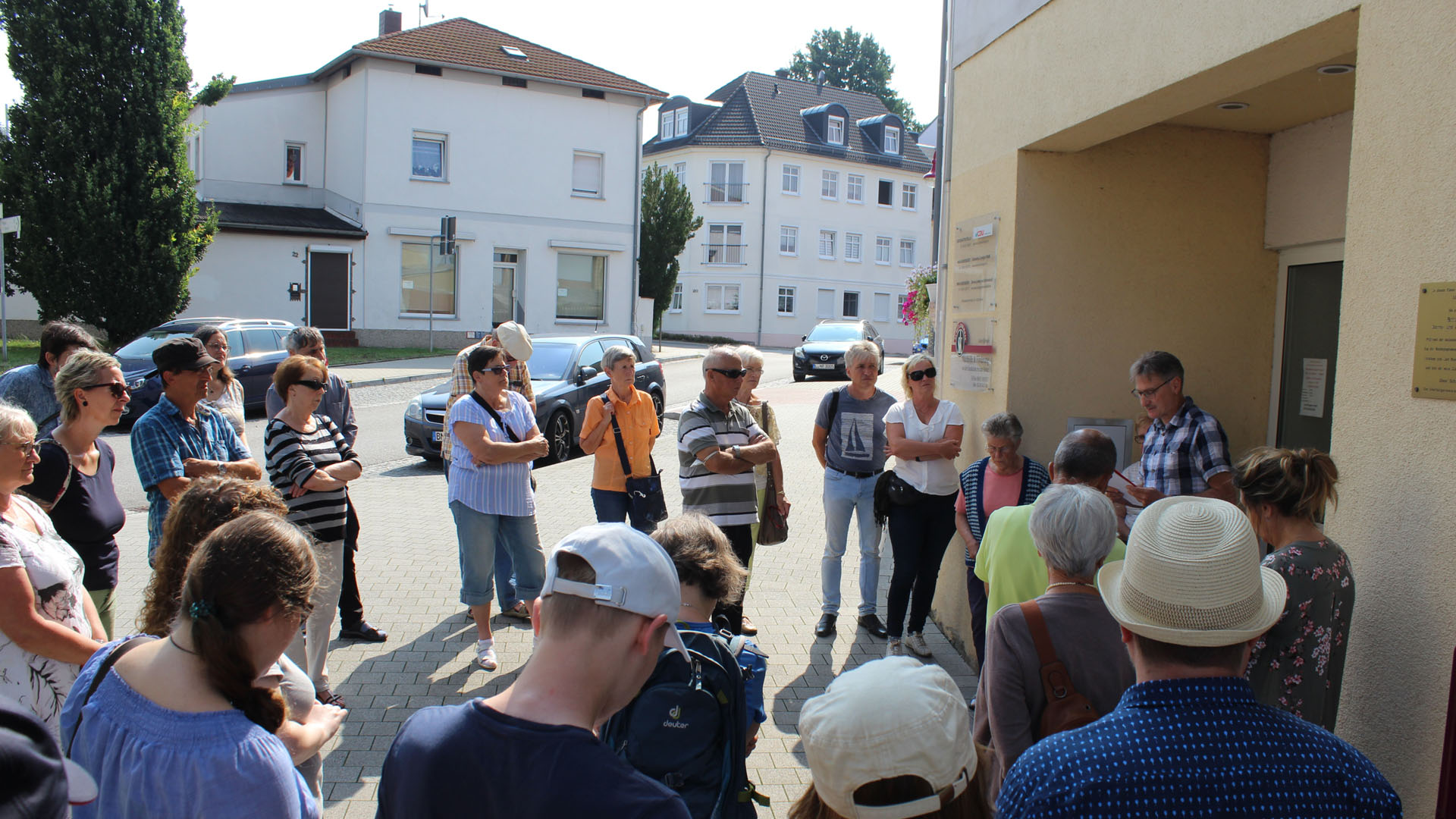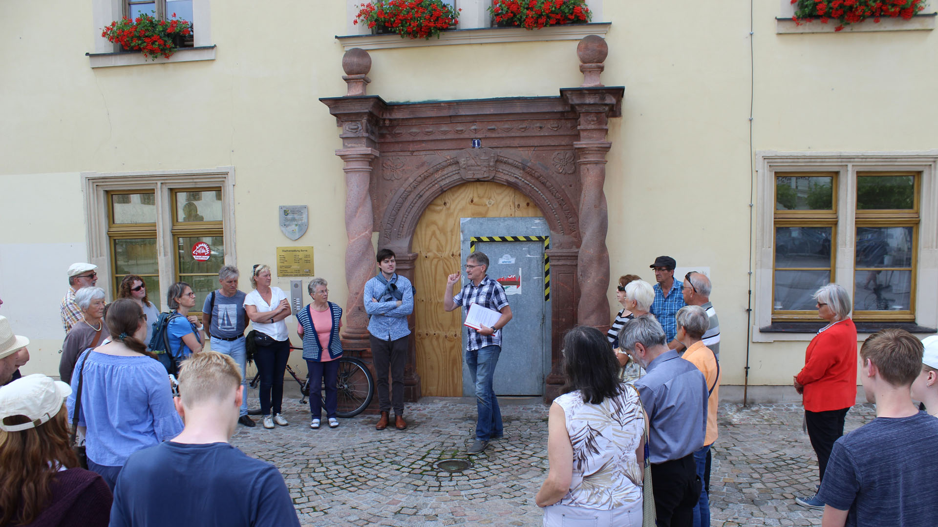 Borna (12.07.2021). Bereits im Mittelalter hatte es jüdisches Leben in Borna gegeben. Darauf weist nicht nur die Helmzier eines jüdischen Kaufmanns im Bornaer Stadtwappen hin. Allerdings seien diese Lebensspuren im Zuge der Pogrome um die 14. Jahrhundertwende, die sich in Sachsen rasch ausbreiteten, wieder verschwunden. Das hatten Forschungen in Archiven nachgewiesen, so berichtete es Thomas Bergner. Der Museumsmitarbeiter hatte eine 30-köpfige Gruppe beim historischen Stadtrundgang am Samstag, dem 10. Juli 2021, auf der Suche nach jüdischen Spuren begleitet.