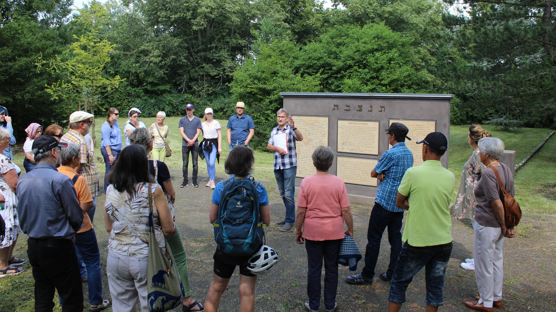 Nach einem Zwischenhalt am Ort der „Schreibtischtäter“, der ehemaligen NSDAP-Kreissitzstelle, in der Wettinstraße endete die informative und zugleich bedrückende Spurensuche an der Gedenkstätte in der Lobstädter Straße. Hier liegen 98 Tote des ehemaligen Konzentrationslagers in Flößberg, einem Außenlager des KZ Buchwald, begraben. Diese wurden nach Kriegsende aus einem gefundenen Massengrab im Flößberger Wald von US-Truppen ins benachbarte Borna, dem damaligen Kreissitz, gebracht und bestattet. Es waren hauptsächlich ungarische Juden, die mit hunderten anderer Zwangsarbeiter im letzten Kriegsjahr eine Fertigungsanlage für Panzerfäuste errichten mussten. Zu dieser Zeit waren die Bornaer Bürger jüdischen Glaubens bereits verschwunden. Sie wurden in Folge des Novemberpogroms von 1938 über Leipzig in verschiedene deutsche Vernichtungslager deportiert oder verließen von allein ihre Heimatstadt.