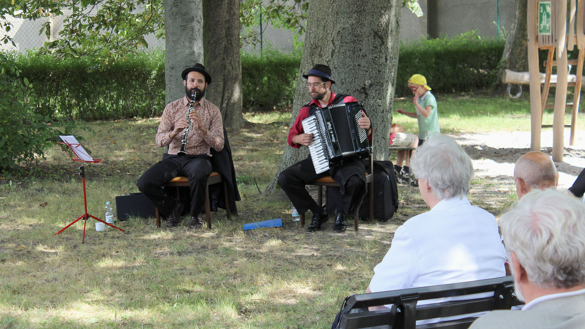 Schwungvoll wurde es im Anschluss mit dem Duo Mamaliga aus Leipzig. Dabei stellten die beiden Musiker, begleitet mit Klarinette und Akkordeon, typische Stücke der Klezmer-Musik vor. Sie verstanden es gekonnt, das Publikum mit einzubinden und es für ihre Musik zu begeistern.