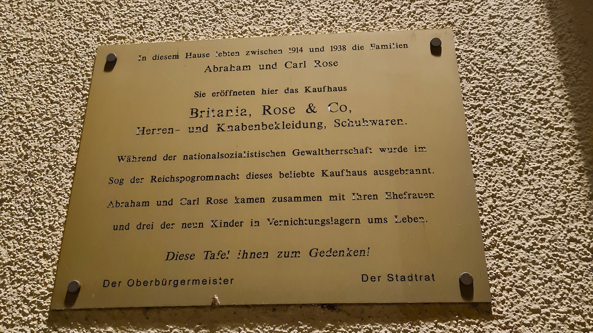 Auch in Borna befinden sich seit 2009, am ehemaligen Kaufhaus „Britania“ in der Roßmarktschen Straße 32, Stolpersteine. Das Kaufhaus war in dieser schrecklichen Nacht ein primäres Ziel. Dabei brannte das Kaufhaus, welches auch das Wohnhaus der Familie Calet „Karl“ Rose war, aus. Von der 6-köpfigen jüdischen Familie überlebte nur eine Person. Die anderen fünf Familienmitglieder wurden deportiert und in den Vernichtungslagern ermordet.
