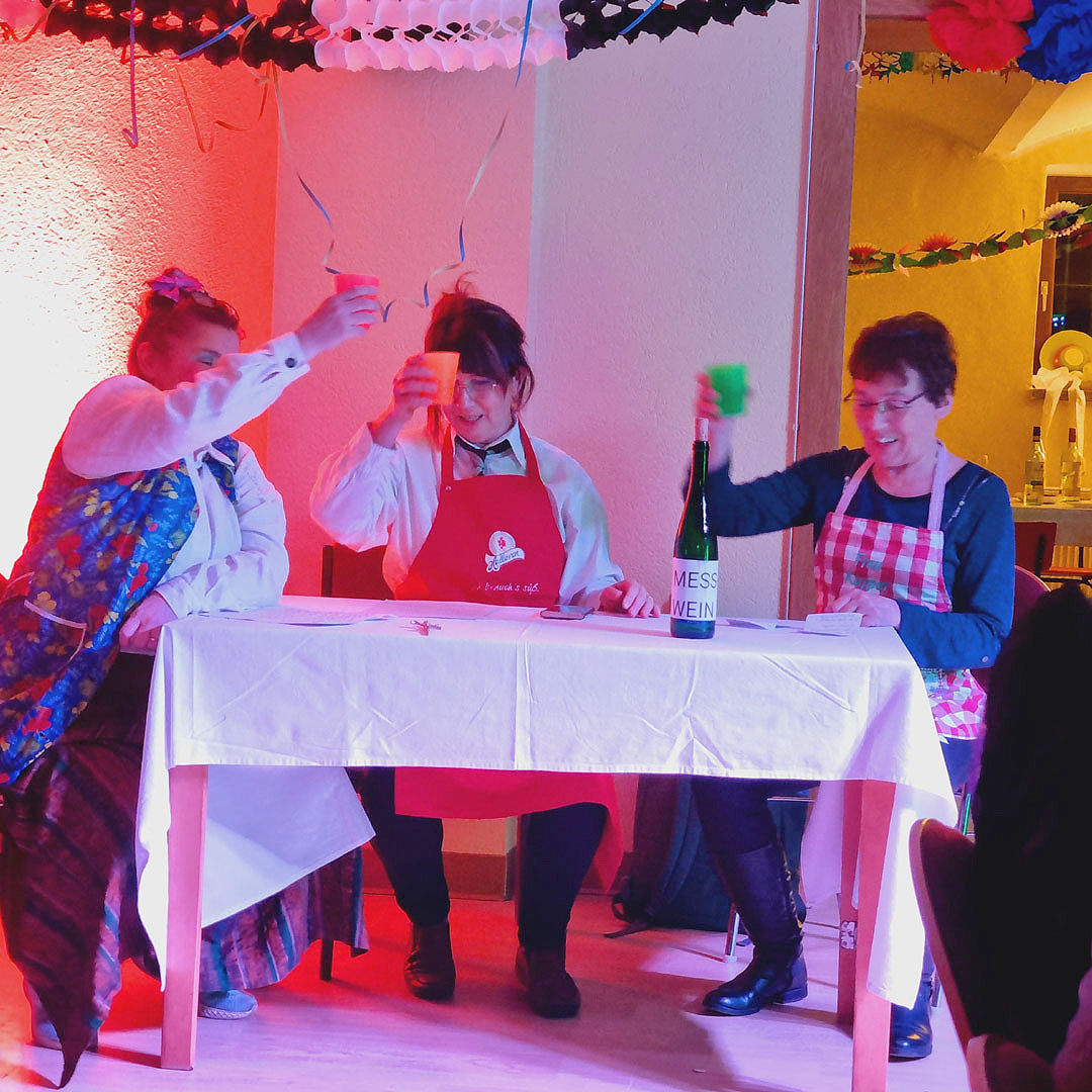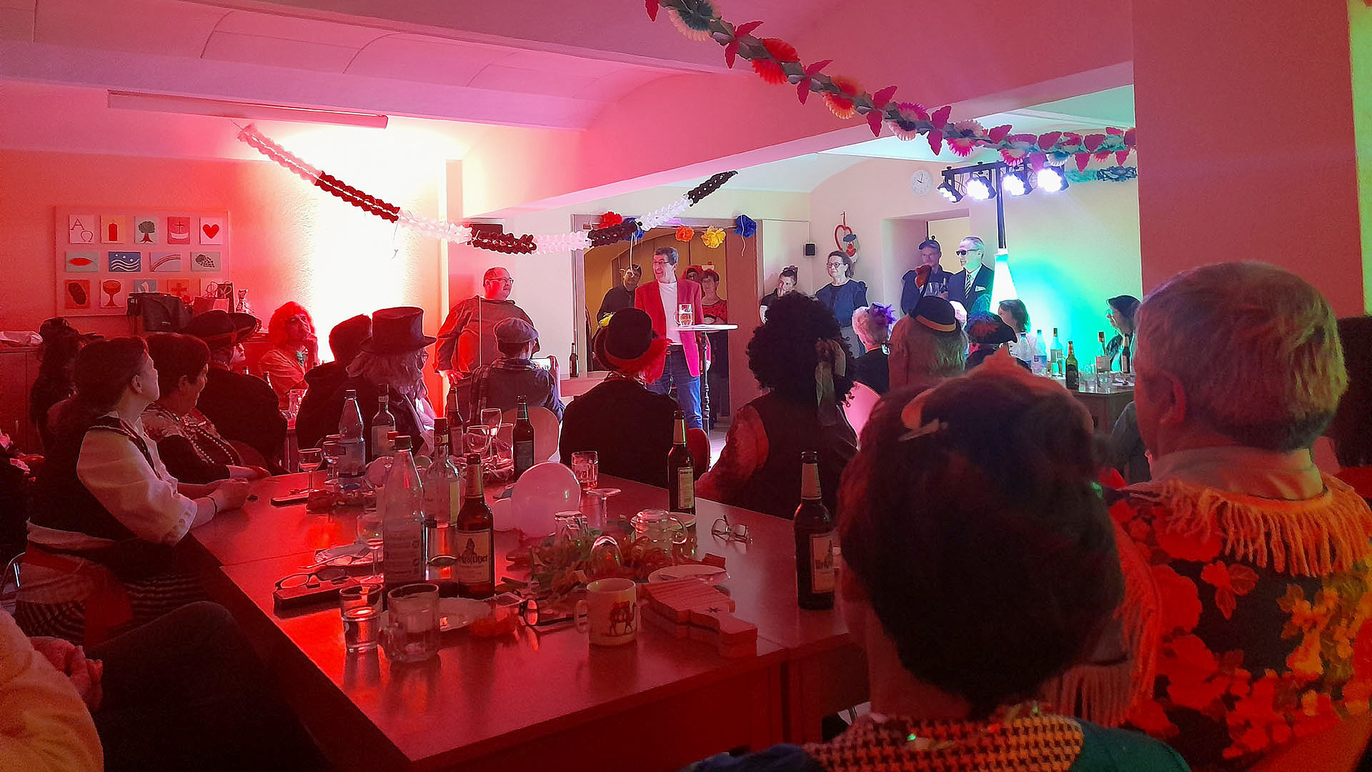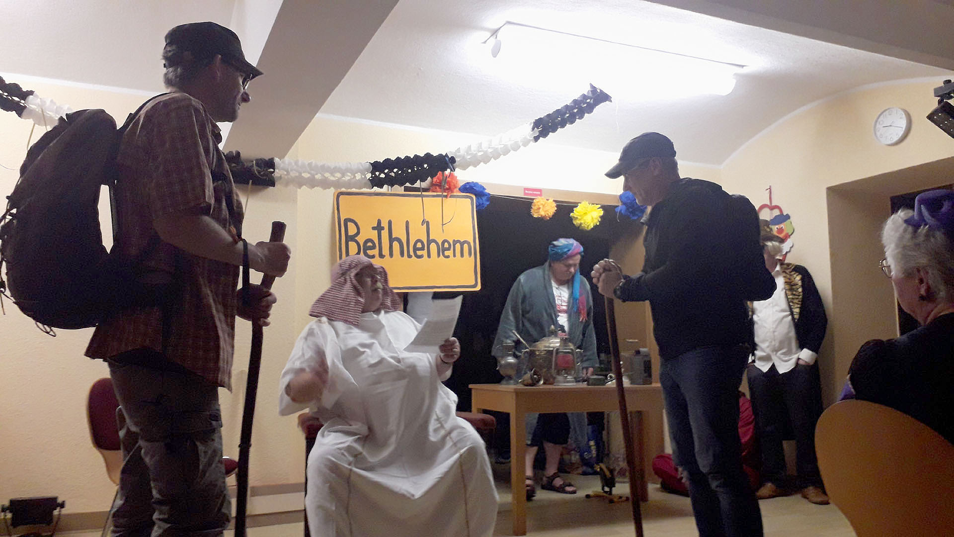 Gemäß dem Faschingsmotto begann das Abendprogramm mit einem kleinen Spieleklassiker aus Kindheitstagen: Autos aufwickeln – nur anders. Aus dem bekannten Zubehör wie Matchbox-Autos, Fäden und Stifte sind Sandspiel-Fahrzeuge, 10-Meter-Seile und Besenstiele geworden. Auf diese Weise wurden die Lachmuskeln ein erstes Mal aufgewärmt, sodass getrost die unterhaltsamen Sketche folgen konnten. Als Nächstes trafen sich drei engagierte Frauen zum Kirchenputz und optimierten nebenbei einige Abläufe und Strukturen in der Gemeinde. Im Anschluss machte sich eine kleine Pilgergruppe nach Bethlehem auf den Weg, um nach einer „Wundersparlampe“ als neue Energiequelle für das Gemeindehaus zu suchen. Nachdem ein Magier mit seinen mathematischen Tricks die Gäste verzaubert hatte, rundete die Büttenrede von Michael Schruth den Abend ab. Mit Leckereien vom Mitbring-Buffet genossen die Närrinnen und Narren das bunte Programm, lachten herzhaft, spendeten viel Beifall und erlebten eine ausgelassene Faschingsfete – also, alles wie immer.