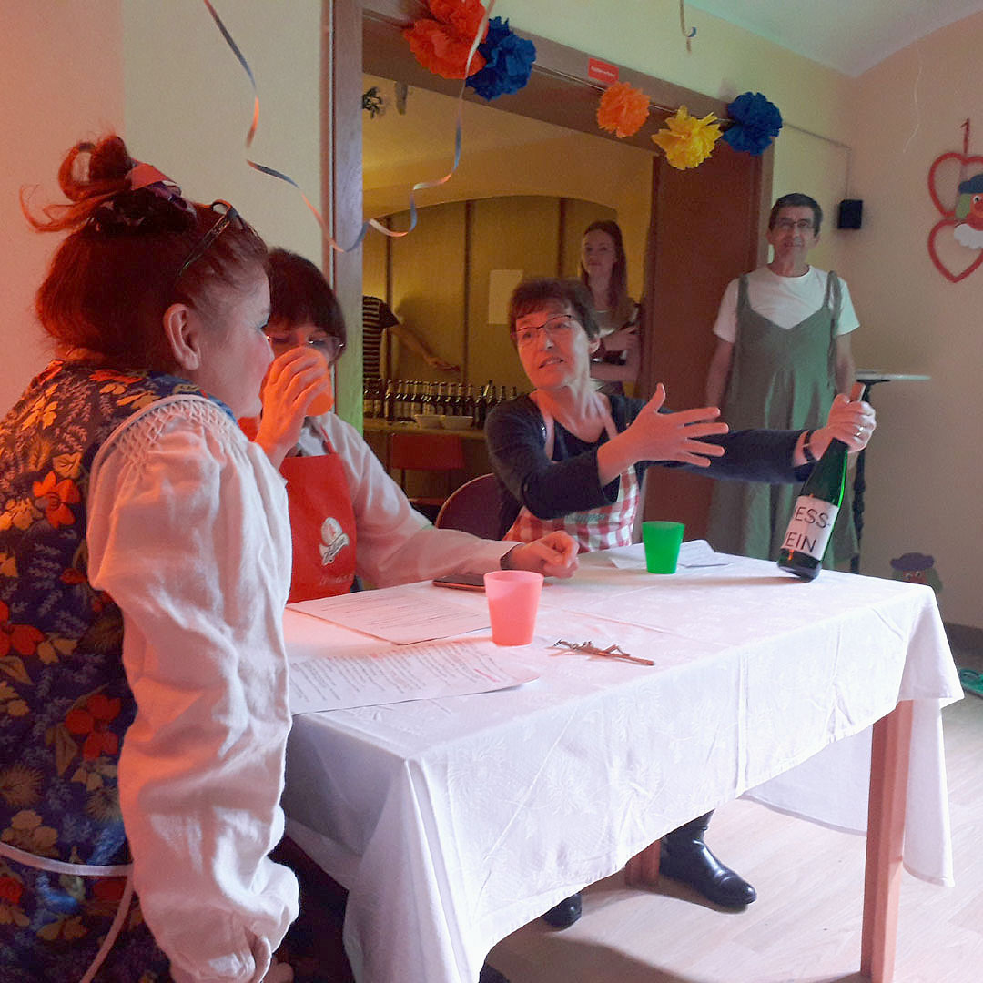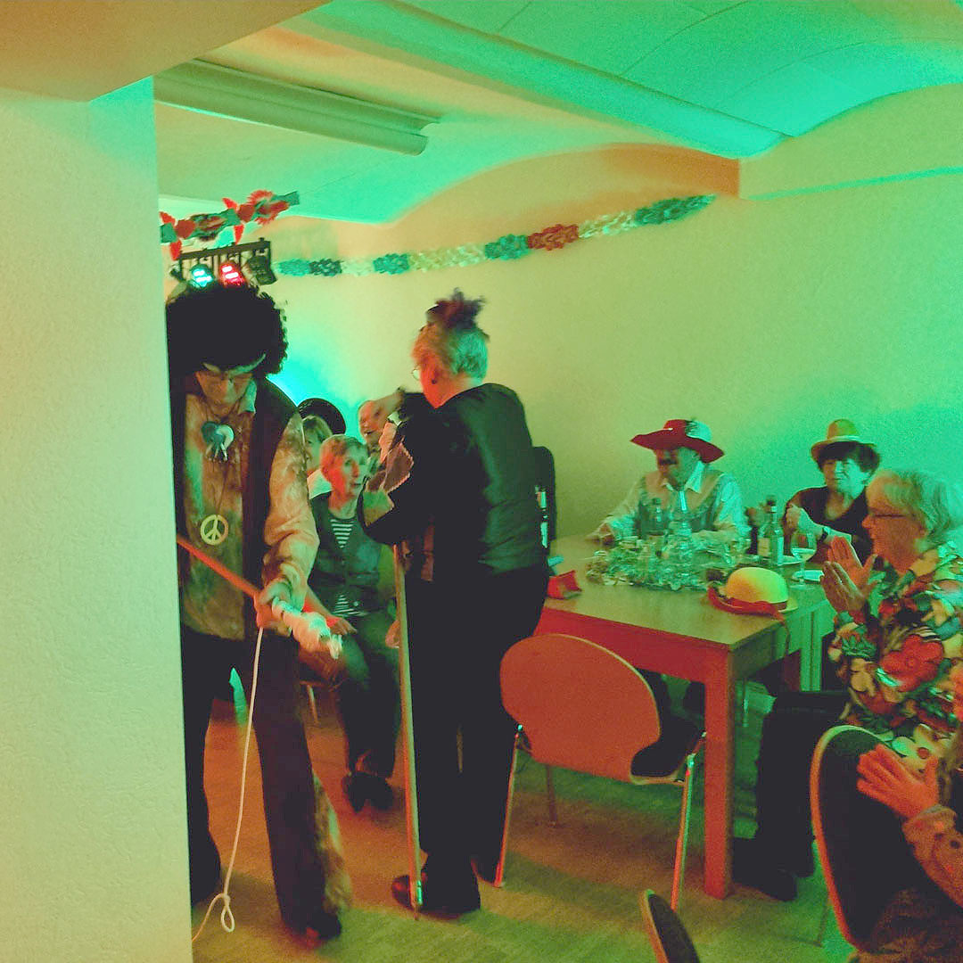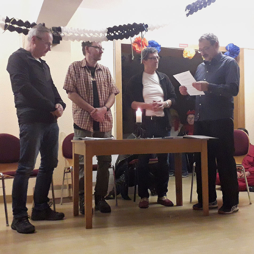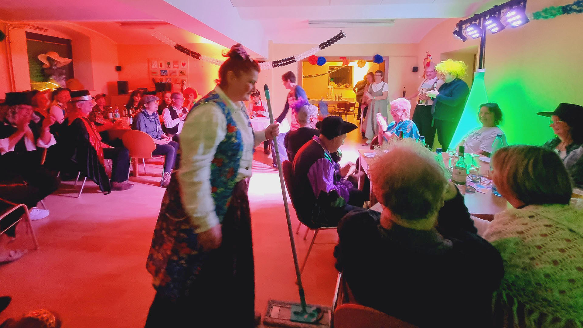Gemäß dem Faschingsmotto begann das Abendprogramm mit einem kleinen Spieleklassiker aus Kindheitstagen: Autos aufwickeln – nur anders. Aus dem bekannten Zubehör wie Matchbox-Autos, Fäden und Stifte sind Sandspiel-Fahrzeuge, 10-Meter-Seile und Besenstiele geworden. Auf diese Weise wurden die Lachmuskeln ein erstes Mal aufgewärmt, sodass getrost die unterhaltsamen Sketche folgen konnten. Als Nächstes trafen sich drei engagierte Frauen zum Kirchenputz und optimierten nebenbei einige Abläufe und Strukturen in der Gemeinde. Im Anschluss machte sich eine kleine Pilgergruppe nach Bethlehem auf den Weg, um nach einer „Wundersparlampe“ als neue Energiequelle für das Gemeindehaus zu suchen. Nachdem ein Magier mit seinen mathematischen Tricks die Gäste verzaubert hatte, rundete die Büttenrede von Michael Schruth den Abend ab. Mit Leckereien vom Mitbring-Buffet genossen die Närrinnen und Narren das bunte Programm, lachten herzhaft, spendeten viel Beifall und erlebten eine ausgelassene Faschingsfete – also, alles wie immer.