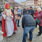 Seinen Besuch setzte der Heilige Nikolaus am Nachmittag auf dem Weihnachtsmarkt der Stadt Borna fort. An diesem Tat.Ort.Nikolaus wurde er musikalisch vom Posaunenchor der evangelisch-lutherischen Gemeinde und Männerchor Borna empfangen. Auf seinem Weg über den Markt begrüßte er die Familien, erzählte ihnen Geschichten aus seinem Leben und verteilte kleine Geschenke an die Kinder. „Tat.Ort.Nikolaus: Gutes tun – kann jeder.“ ist eine Aktion des Bonifatiuswerkes der deutschen Katholiken.