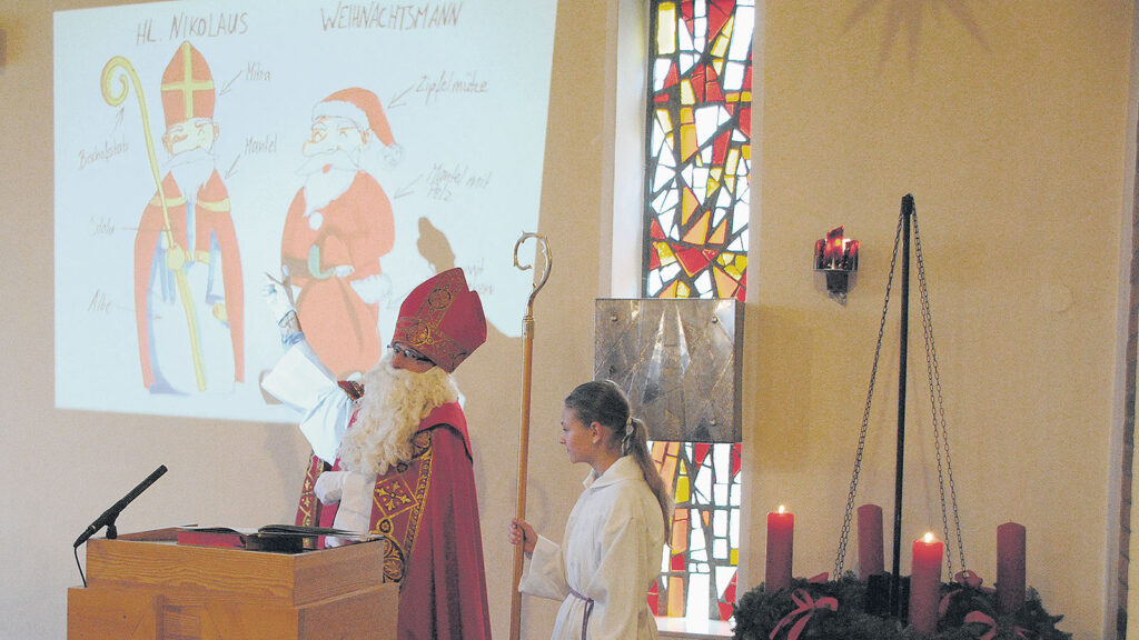 Im Familiengottesdienst erklärt der Nikolaus den Unterschied zwischen ihm und dem Weihnachtsmann. Ein Bild, das mit einem Beamer an der Wand erscheint, macht es anschaulich.