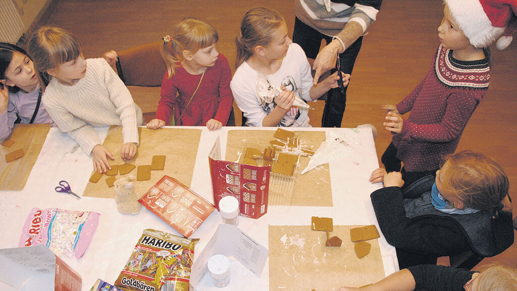 Die Kinder können Lebkuchenhäuser basteln während Eltern Zeit haben fürs Gespräch.