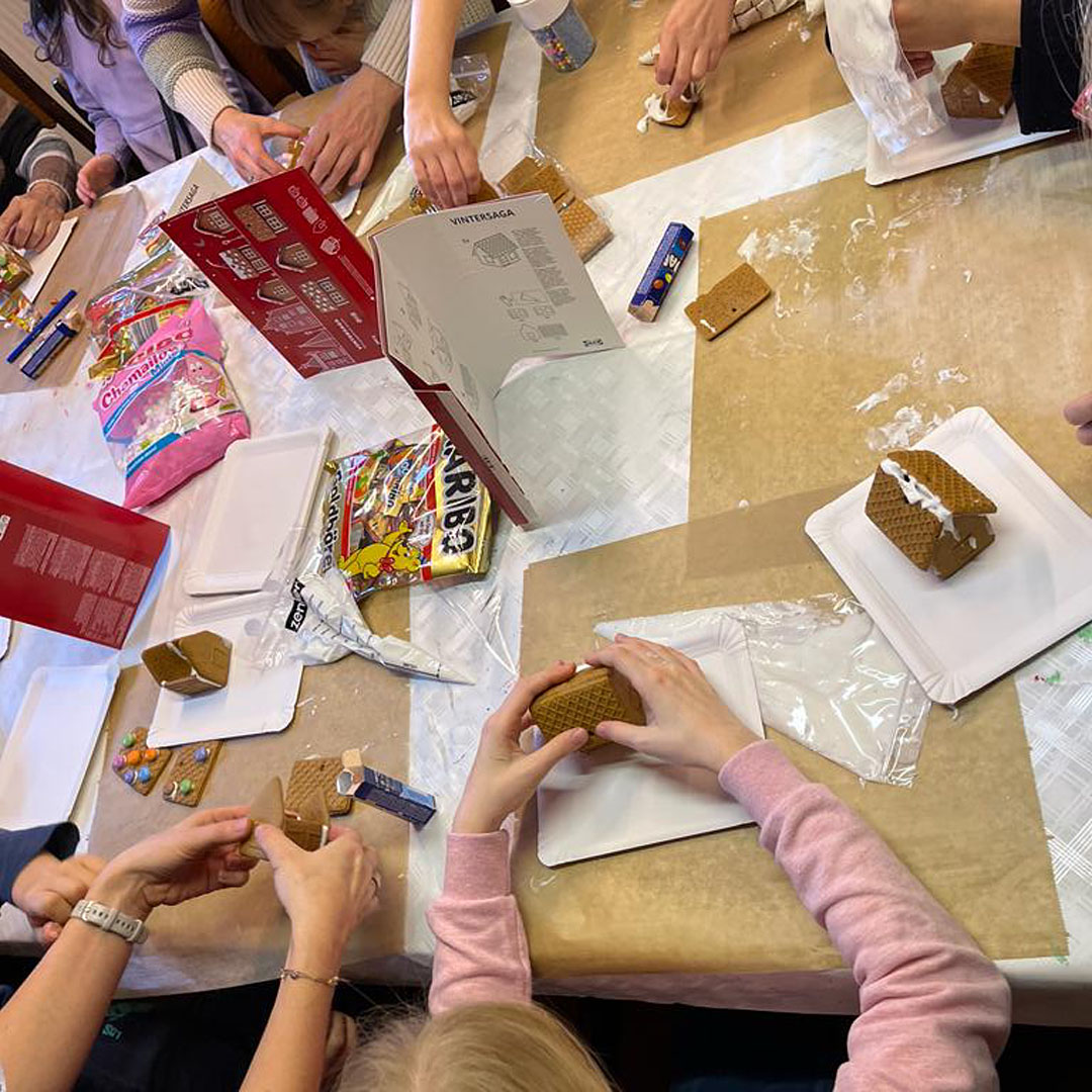 Die Kinder können Lebkuchenhäuser basteln während Eltern Zeit haben fürs Gespräch.