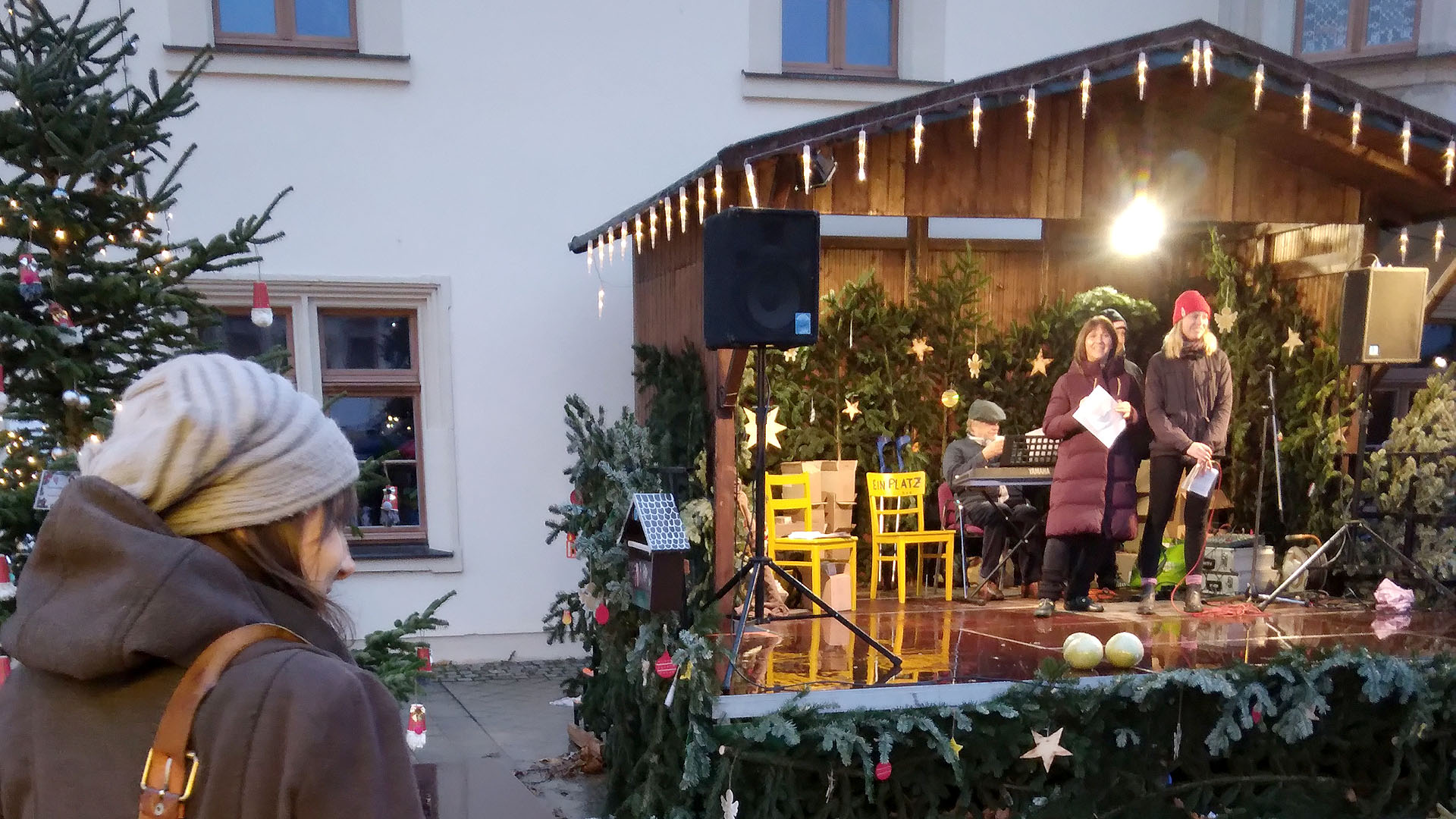 Dann war der Augenblick gekommen, auf den die Mädchen und Jungen gewartet hatten: Der Nikolaus lud sie zu sich auf die Bühne ein. Wer wollte, konnte ein Selfie mit ihm machen und sich über einen Schokonikolaus freuen. Die zwischenzeitliche Frage der Moderatorin, ob denn der Nikolaus bereits bei ihnen zu Hause war, bejahten alle befragten Kinder – konfessionsunabhängig. Ein Mädchen verriet sogar, dass es fleißig ihre Schuhe geputzt hatte. Aber „meine Mama hatte einfach neue Schuhe aus dem Schrank hingestellt und hatte trotzdem etwas bekommen“. Die Rückmeldungen der Jüngsten waren erfreulich zu hören, bedeuteten sie doch, dass der Nikolaus auch in der Diaspora einen festen Platz in den Familien hat. In der Zwischenzeit sangen die übrigen Zuschauer, begleitet am Piano von Eberhart Köhler, bekannte Advents- und Weihnachtslieder, wie „In der Weihnachtsbäckerei“, „Alle Jahre wieder“ oder „Schneeflöckchen, Weißröckchen“ – so blieb die Stimmung trotz des nass-kalten Wetters weiter fröhlich und heiter.