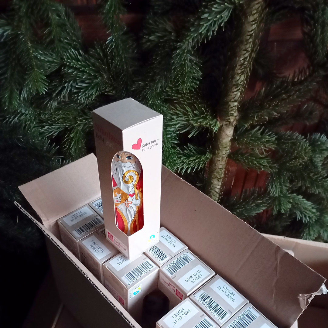 Dass jeder Nikolaus sein kann, zeigt das Bonifatiuswerk der deutschen Katholiken auch in diesem Jahr wieder mit seiner Aktion „Tat.Ort.Nikolaus: Gutes tun – kann jeder.“ Zum fünften Mal unterstützt das Hilfswerk mit finanziellen Mitteln Initiativen und Projekte, die nach dem Vorbild des Hl. Nikolaus handeln. Maria Schruth, Organisatorin des Nikolaus-Besuches in Borna, freute sich über die positiven Rückmeldungen und resümierte, dass es gelang „Erwachsene und Kinder mit Gesang als verbindendes Element zusammen- und ihnen den Hl. Nikolaus mit seinen Werten, wofür er steht, näherzubringen“. Die „Tat.Ort.Nikolaus“-Aktion gehört zur bundesweit bekannten Weihnachtsmannfreien Zone, die das Bonifatiuswerk vor 22 Jahren ins Leben gerufen hat, um den Hl. Nikolaus mit seinen christlichen Werten wie Gerechtigkeit, Nächstenliebe und Hilfsbereitschaft wieder mehr in den Fokus der Gesellschaft zu rücken. Das Hilfswerk förderte den Nikolaus-Besuch, auf Einladung von Stadtverwaltung und katholischer Gemeinde, auf dem Bornaer Weihnachtsmarkt u.a. mit 200 Schokonikoläusen.