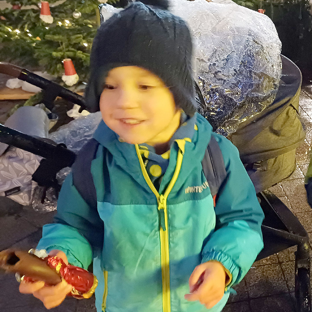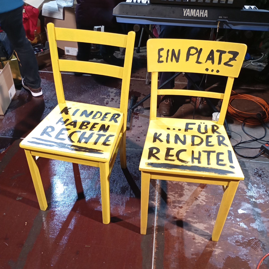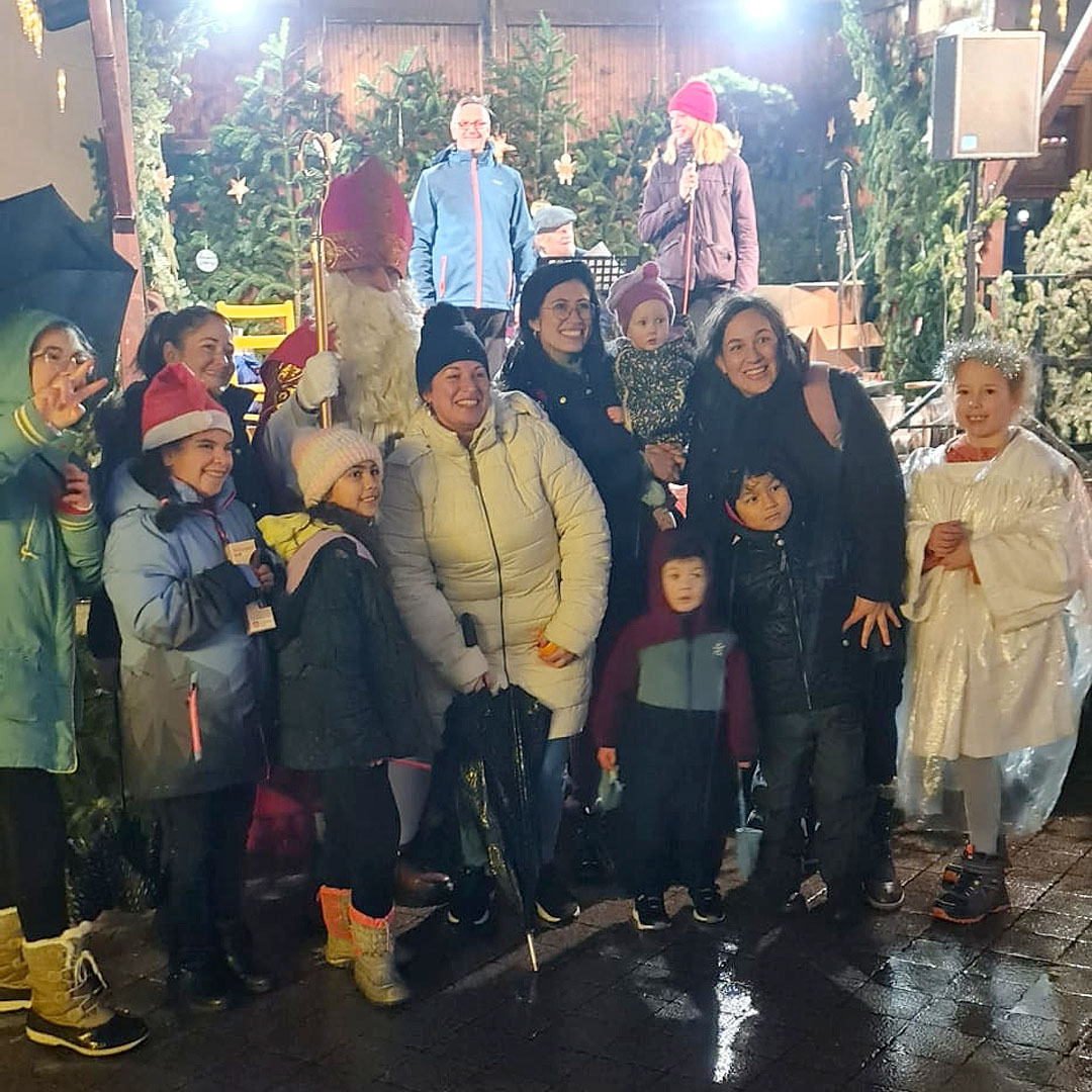 Der Nikolaus ließ es sich danach nicht nehmen, auch die anderen Menschen auf dem Markt persönlich zu begrüßen, sich für die musikalische Begleitung zu bedanken und unter ihnen kleine Aufmerksamkeiten, wie Schokonikoläuse und Orangen, zu verteilen. Die Jugendfeuerwehr am benachbarten Marktstand freute sich ebenso über den Nikolaus-Besuch, wie eine Gruppe lateinamerikanischer Familien – die diese in Deutschland verbreitete Tradition für sich neu kennenlernte. Zum Abschluss der gut 1-stündigen Aktion gab es noch einen Überraschungsgast für den Nikolaus: Dieser wunderte sich bereits von Anfang an über zwei gelbe Stühle mit der Aufschrift „Ein Platz für Kinderrechte“ auf der Bühne. Eine Erklärung gaben ihm die Sternsinger. Sie erzählten von ihrer Aktion Dreikönigssingen 2025, die um den 6. Januar herum stattfindet. Wie der Hl. Nikolaus, der sich zeitlebens für Kinder eingesetzt hat und als deren Patron gilt, rücken auch die Sternsinger die Kinderrechte in den Mittelpunkt ihrer diesjährigen Aktion. Der Nikolaus als deren Botschafter, zumindest für einen Tag – ein schönes Abschiedsbild.