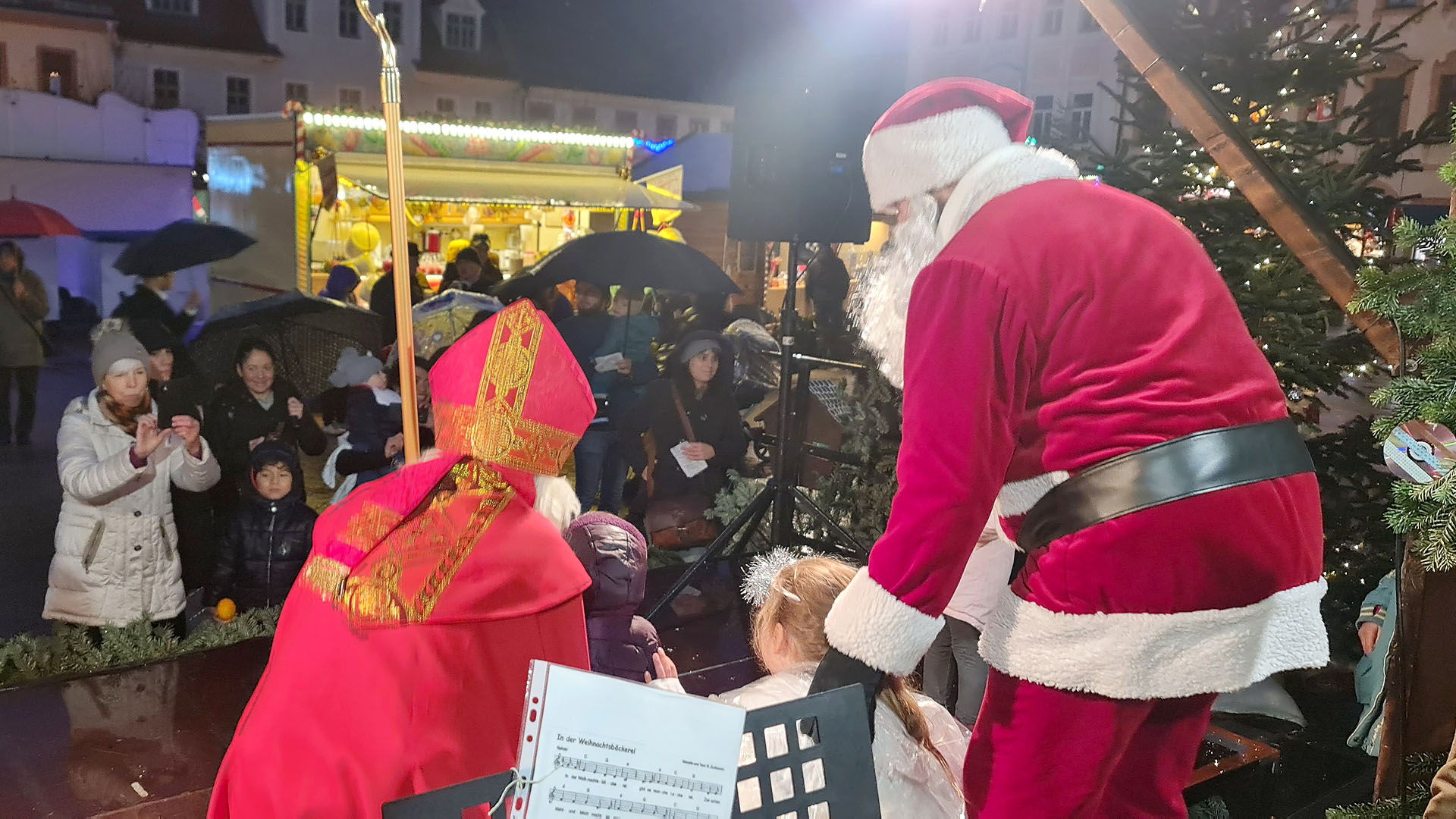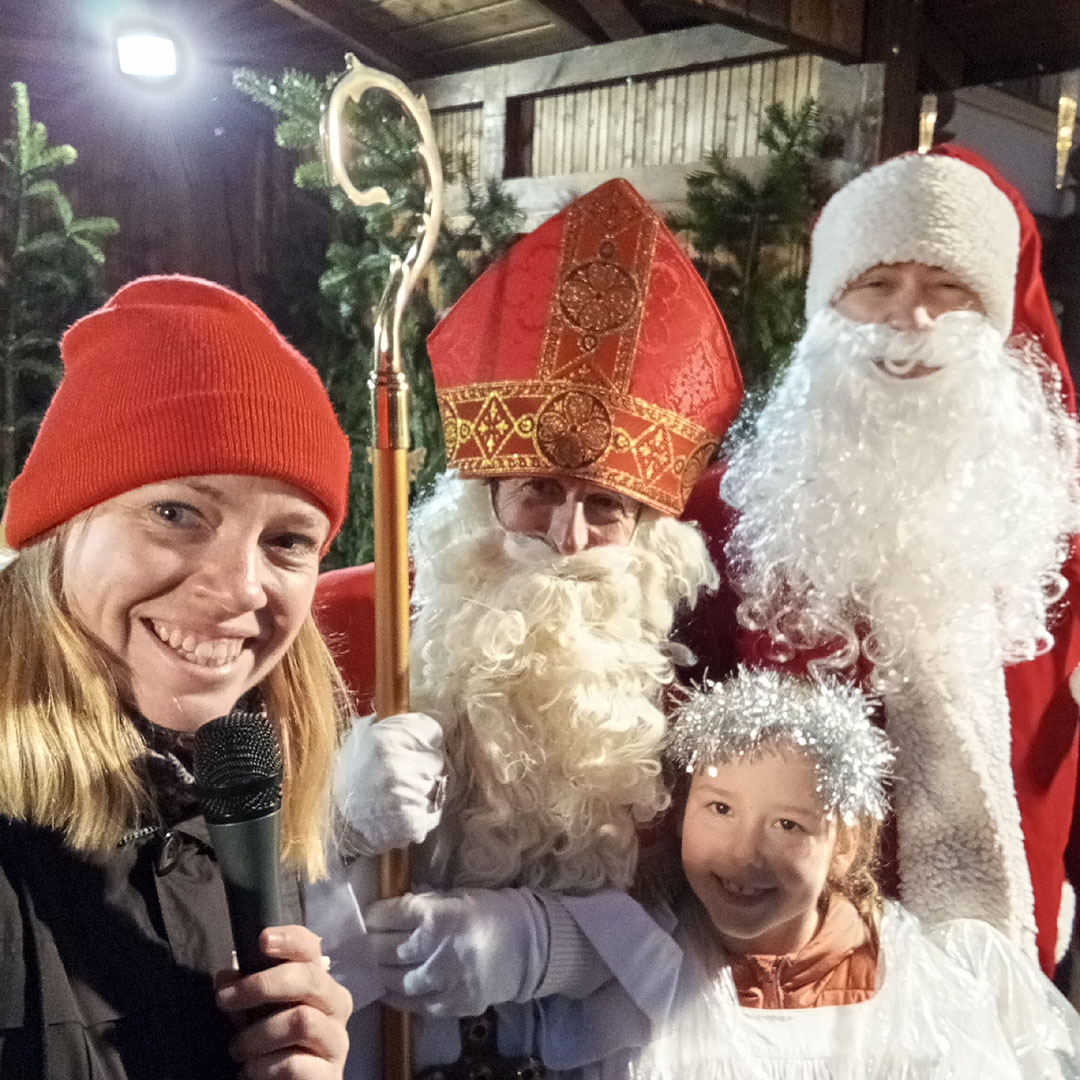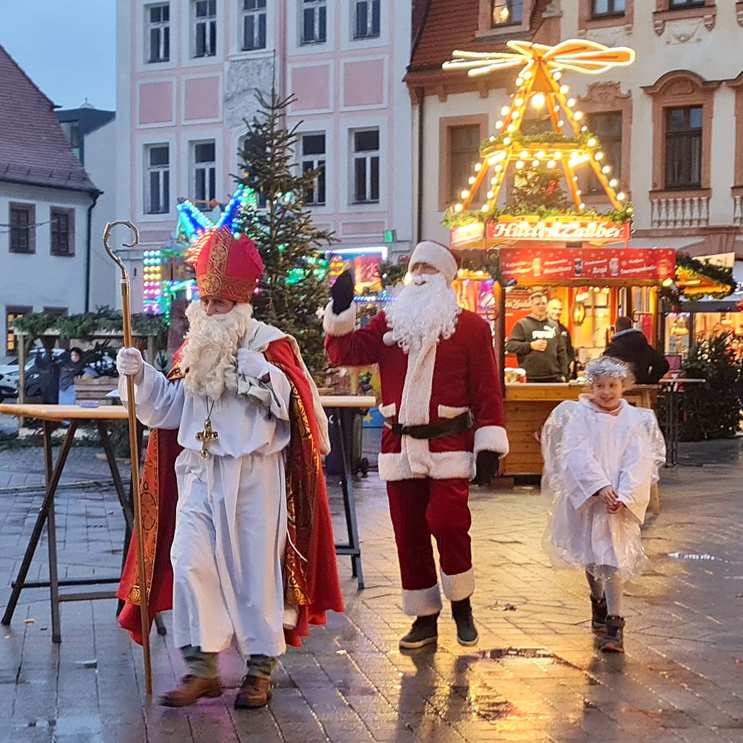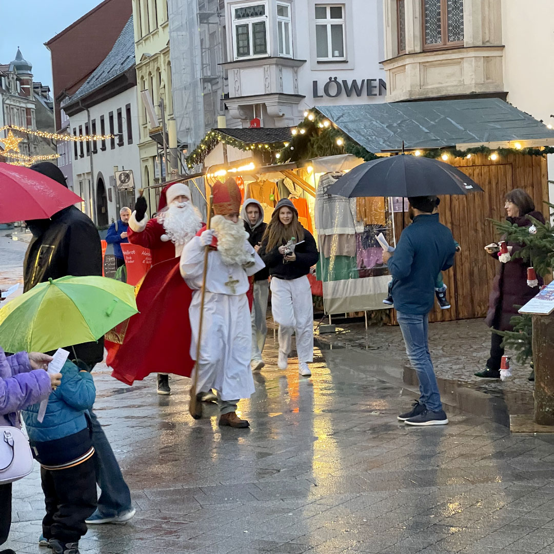 Borna (11./21.12.2024). „Lasst uns froh und munter sein…“ schallte es am vergangenen Freitagnachmittag, dem 6. Dezember 2024, über den Bornaer Weihnachtsmarkt. Wegen des Dauerregens der vorangegangenen Tage war der Markt nur mäßig besucht. Doch der angekündigte Besuch des Nikolaus‘ veränderte die Situation schlagartig. Viele Familien mit ihren Kindern trotzten dem Wetter und kamen zur Begrüßung des Heiligen in ihrer Heimatstadt. Er hatte für diesen Tat.Ort.Nikolaus auch den Weihnachtsmann und einen Engel als seine Gäste mitgebracht. Gemeinsam stellten sie sich erst einmal musikalisch auf der Bühne den kleinen und großen Zuschauern vor, bevor die beiden Männer in einem unterhaltsamen Interview die Fragen von Moderatorin Anna-Sophie Kupper beantworteten. Dabei zeigten sie die Unterschiede zwischen ihnen auf und stellten fest, dass jeder „seine“ Zeit hat. Der Nikolaus erzählte kurze Geschichten aus seinem Leben, die christliche Werte wie Gerechtigkeit, Nächstenliebe und Hilfsbereitschaft in den Mittelpunkt des Handelns stellten: „Gutes tun – kann jeder.“ Und er erklärte auch, was es eigentlich mit der weitverbreiteten Tradition von Orangen in geputzten Schuhen am Nikolaustag auf sich hat.