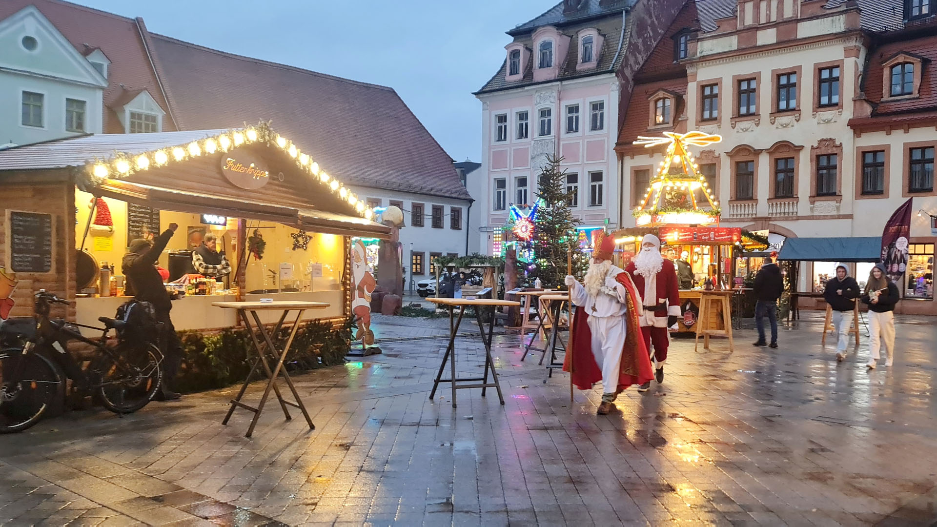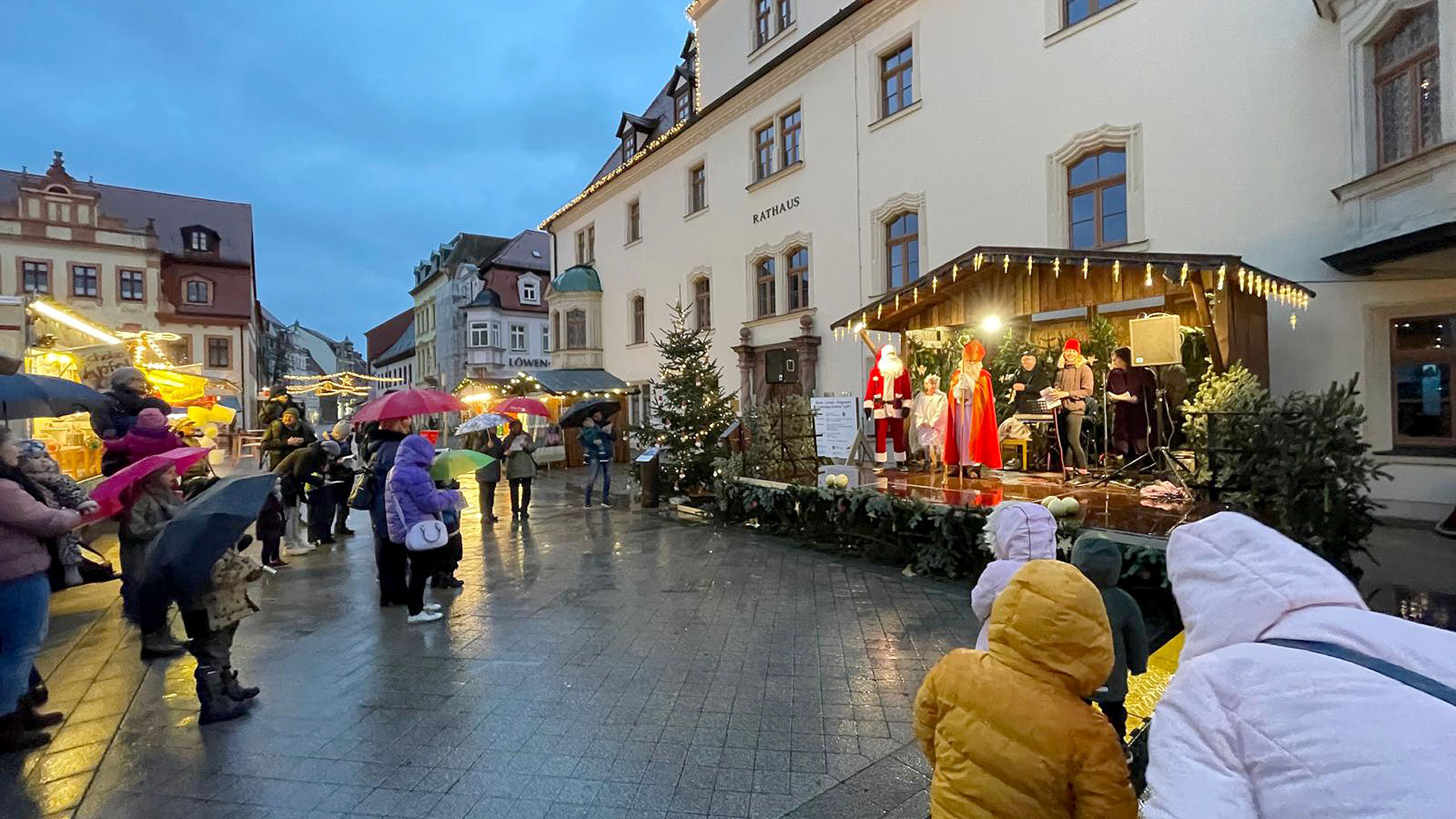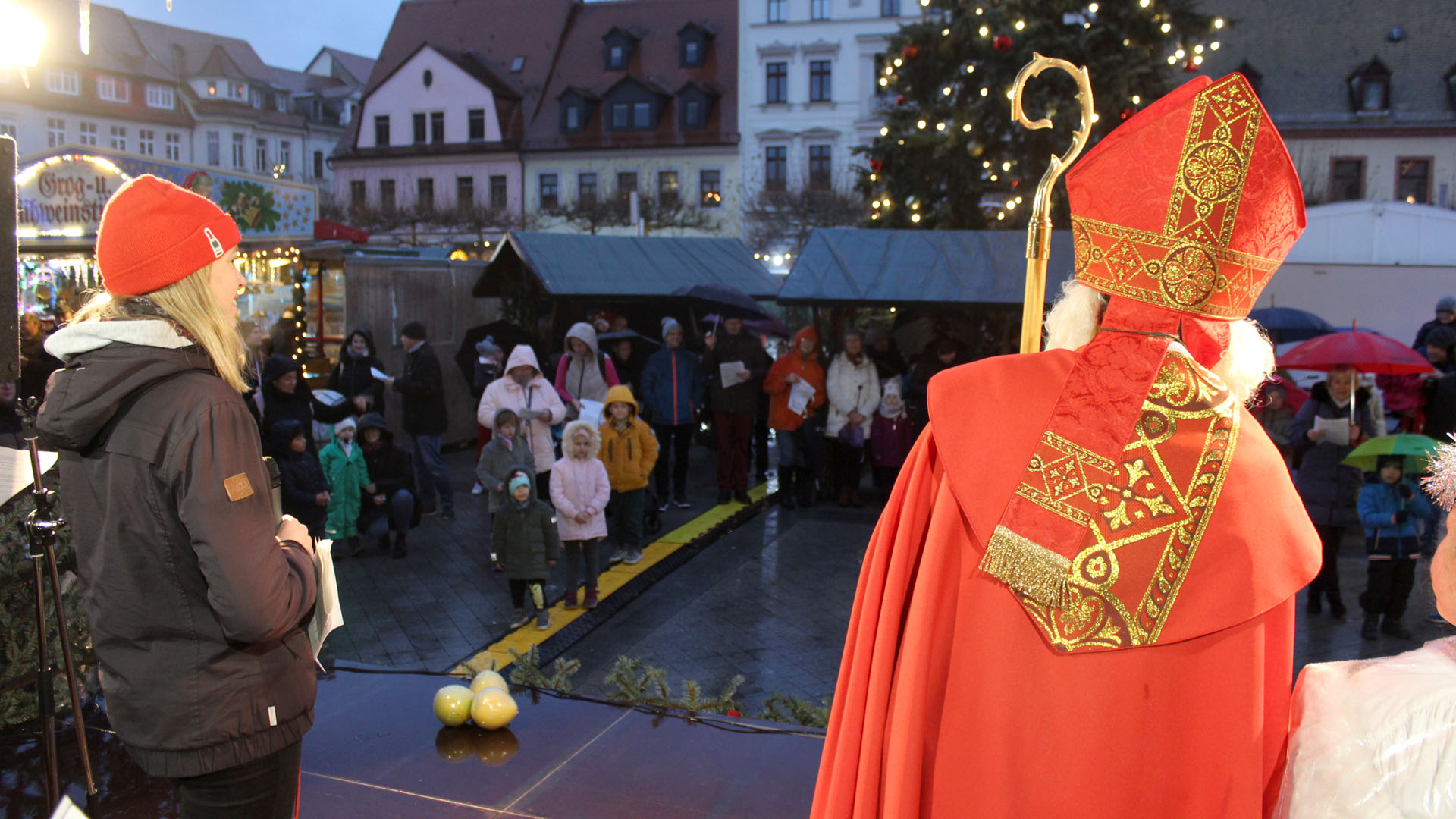Borna (11./21.12.2024). „Lasst uns froh und munter sein…“ schallte es am vergangenen Freitagnachmittag, dem 6. Dezember 2024, über den Bornaer Weihnachtsmarkt. Wegen des Dauerregens der vorangegangenen Tage war der Markt nur mäßig besucht. Doch der angekündigte Besuch des Nikolaus‘ veränderte die Situation schlagartig. Viele Familien mit ihren Kindern trotzten dem Wetter und kamen zur Begrüßung des Heiligen in ihrer Heimatstadt. Er hatte für diesen Tat.Ort.Nikolaus auch den Weihnachtsmann und einen Engel als seine Gäste mitgebracht. Gemeinsam stellten sie sich erst einmal musikalisch auf der Bühne den kleinen und großen Zuschauern vor, bevor die beiden Männer in einem unterhaltsamen Interview die Fragen von Moderatorin Anna-Sophie Kupper beantworteten. Dabei zeigten sie die Unterschiede zwischen ihnen auf und stellten fest, dass jeder „seine“ Zeit hat. Der Nikolaus erzählte kurze Geschichten aus seinem Leben, die christliche Werte wie Gerechtigkeit, Nächstenliebe und Hilfsbereitschaft in den Mittelpunkt des Handelns stellten: „Gutes tun – kann jeder.“ Und er erklärte auch, was es eigentlich mit der weitverbreiteten Tradition von Orangen in geputzten Schuhen am Nikolaustag auf sich hat.