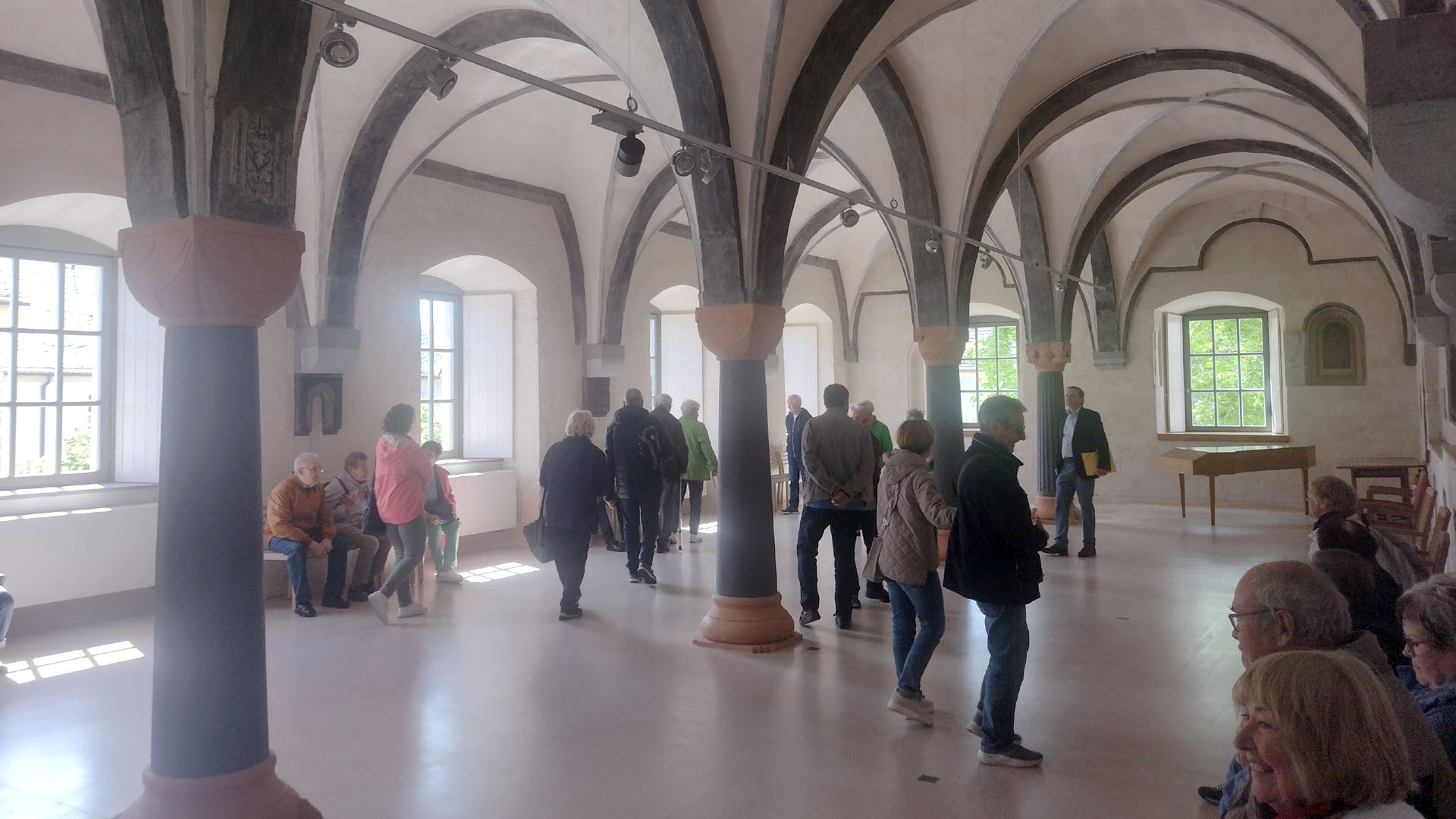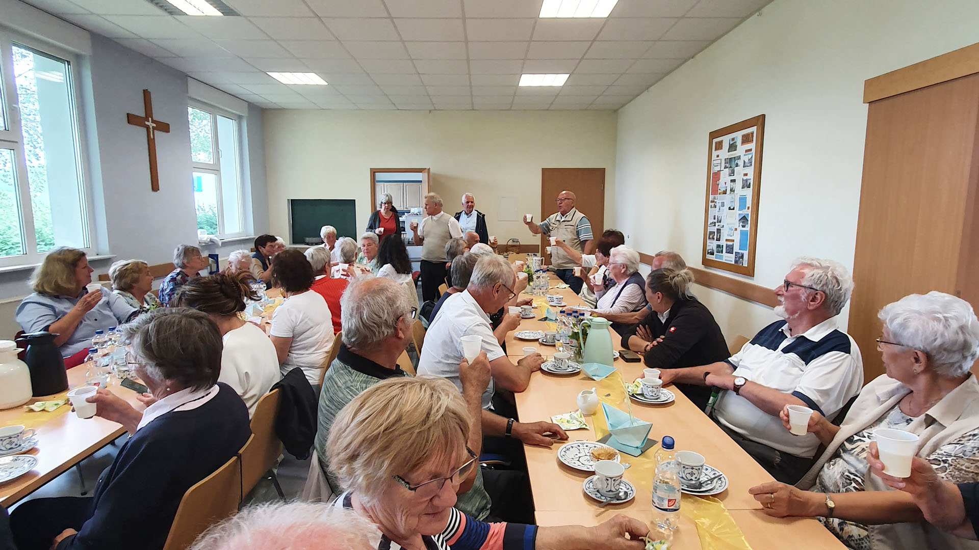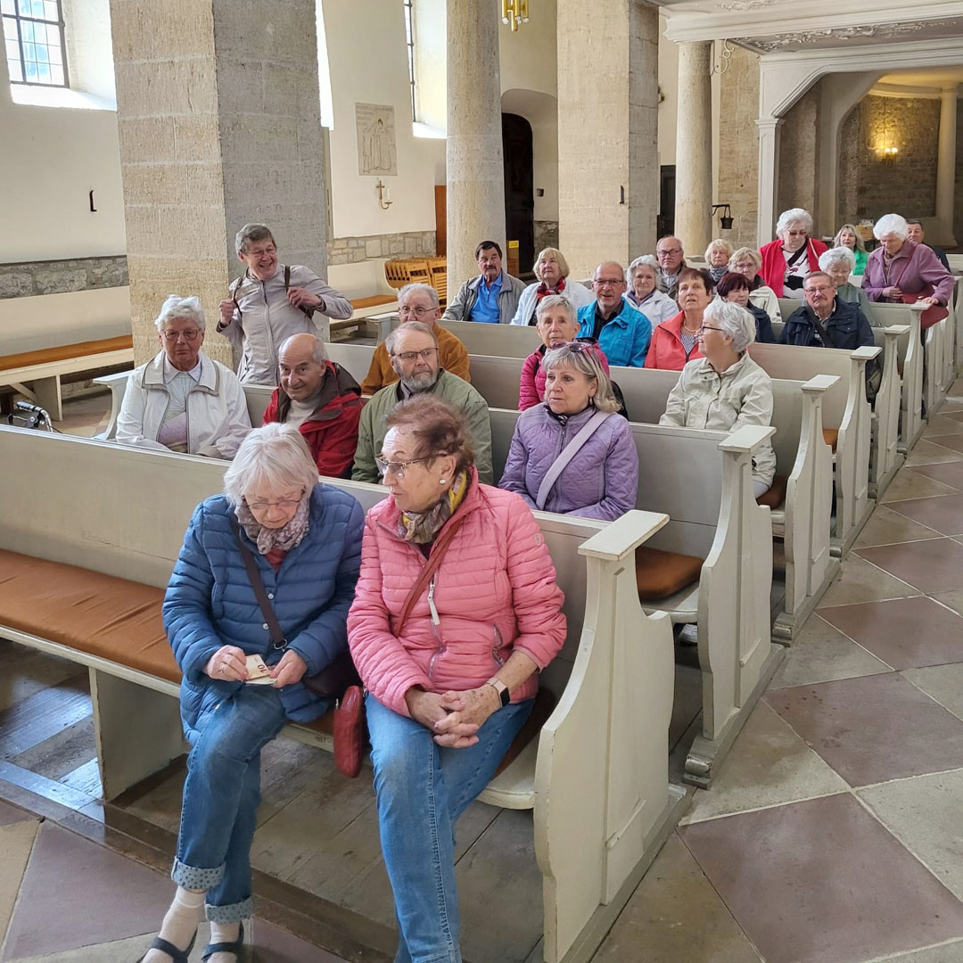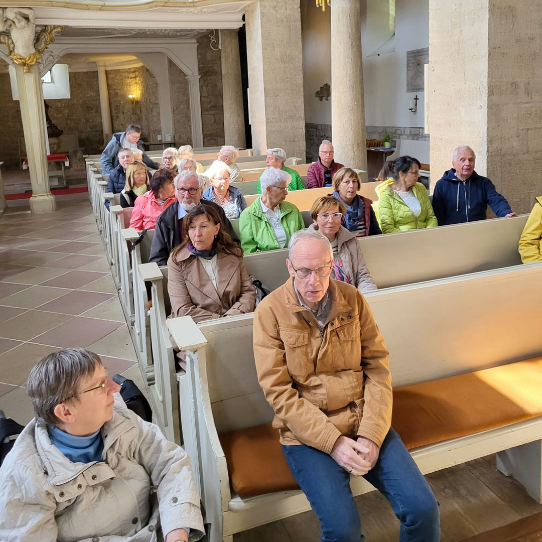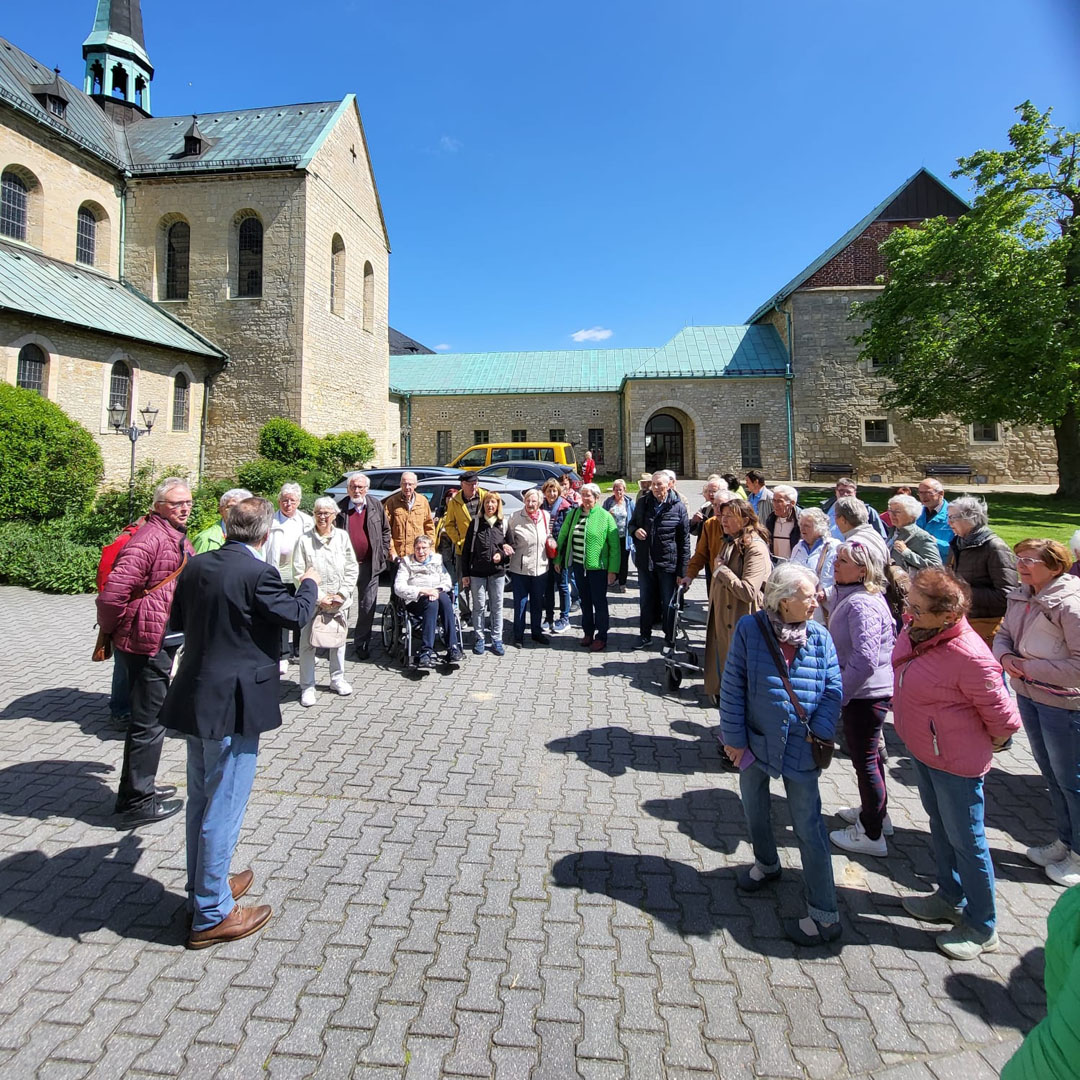Programmauftakt war das gemeinsame Mittagsgebet um 12:00 Uhr mit den Benediktinern in der Klosterkirche. Wie Gabriele Kleine, Mitorganisatorin der Seniorenfahrt, berichtete, „war für unsere Teilnehmende das Gebet mit den Mönchen eine besondere Erfahrung. Im Anschluss gab es ein sehr schmackhaftes Mittagessen in einem historischen Raum mit originalen Malereien im Ekkehard-Haus – von dem Ambiente waren alle begeistert.“ Dass das Kloster Huysburg eine wechselvolle Geschichte hat, wurde den Senioren auf einer kurzweiligen Klosterführung ab 14:00 Uhr erläutert. Im Anschluss stärkten sich alle beim Vesper mit Kaffee und Kuchen, bevor der Reisebus pünktlich gegen 16:30 Uhr zur Heimfahrt aufbrach. Damit ging ein interessanter Mai-Ausflug zu Ende.