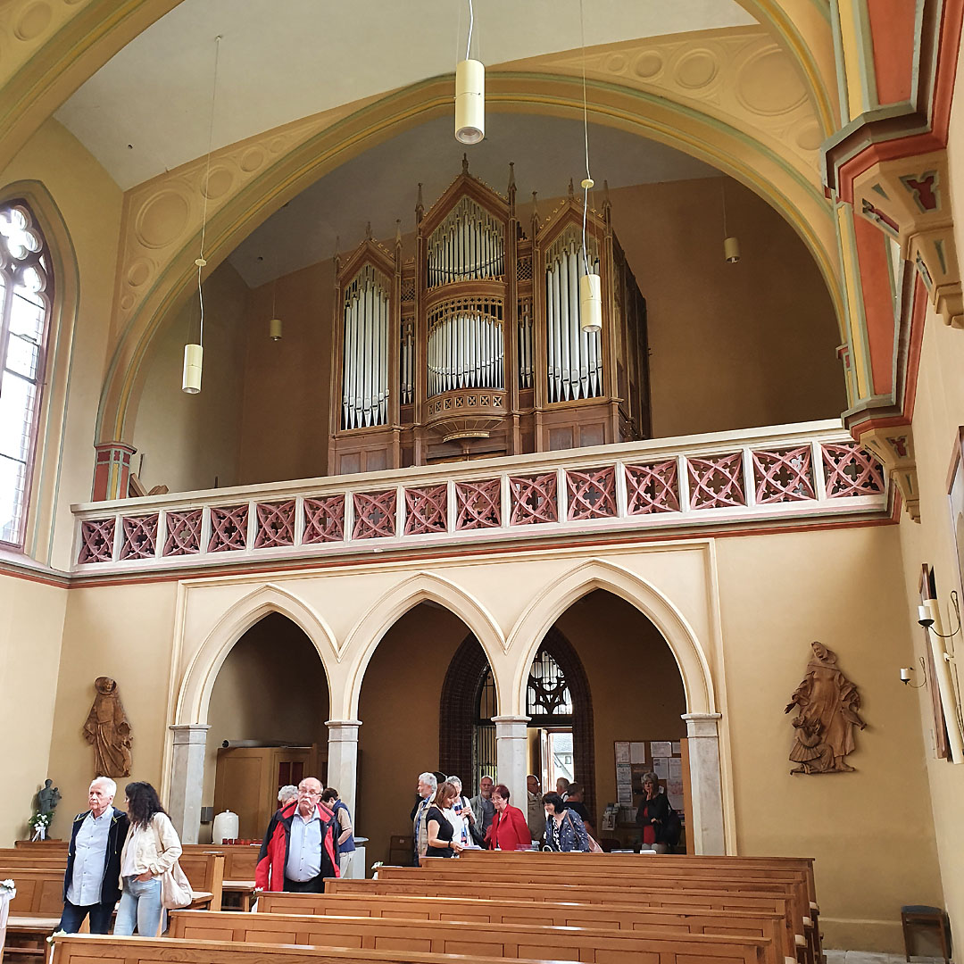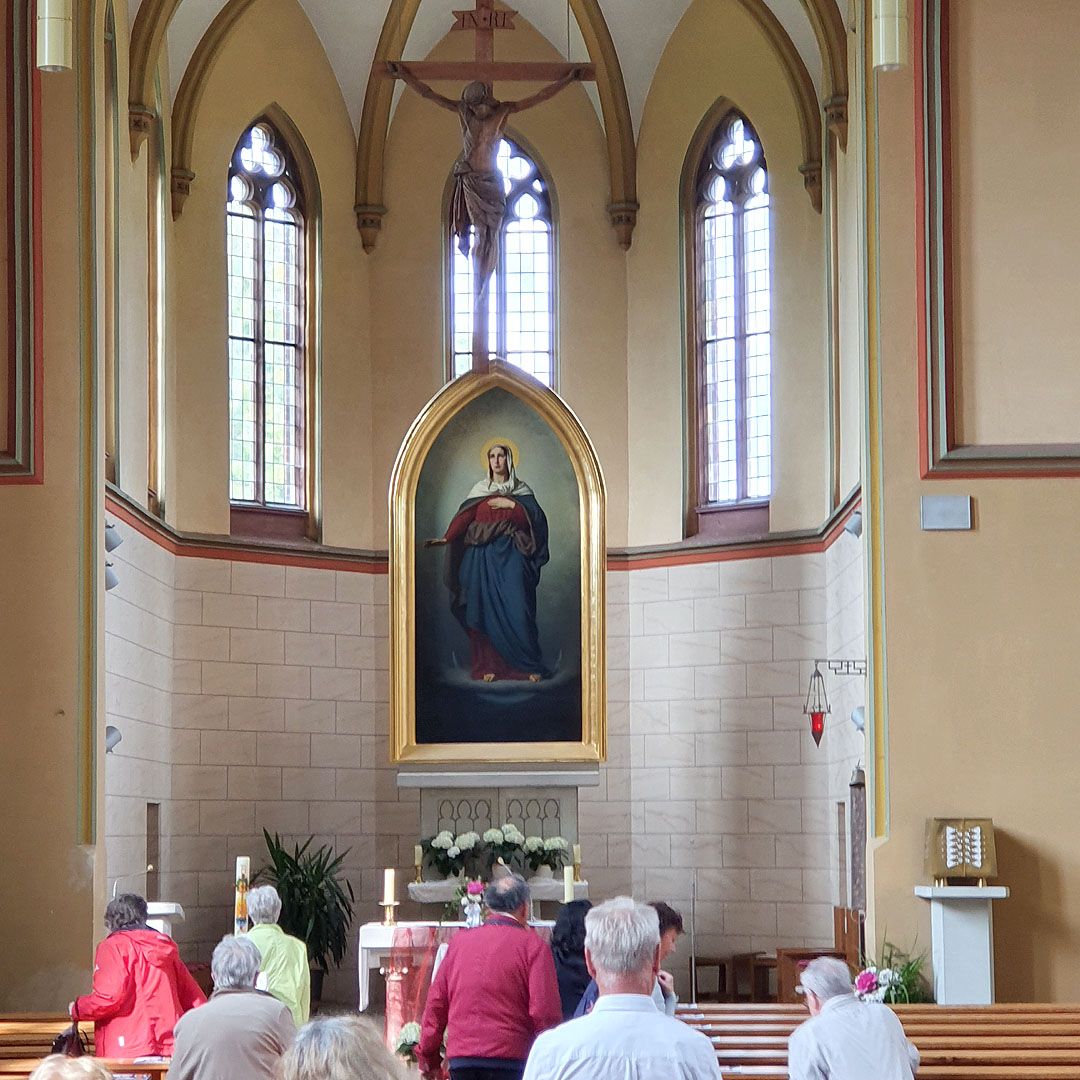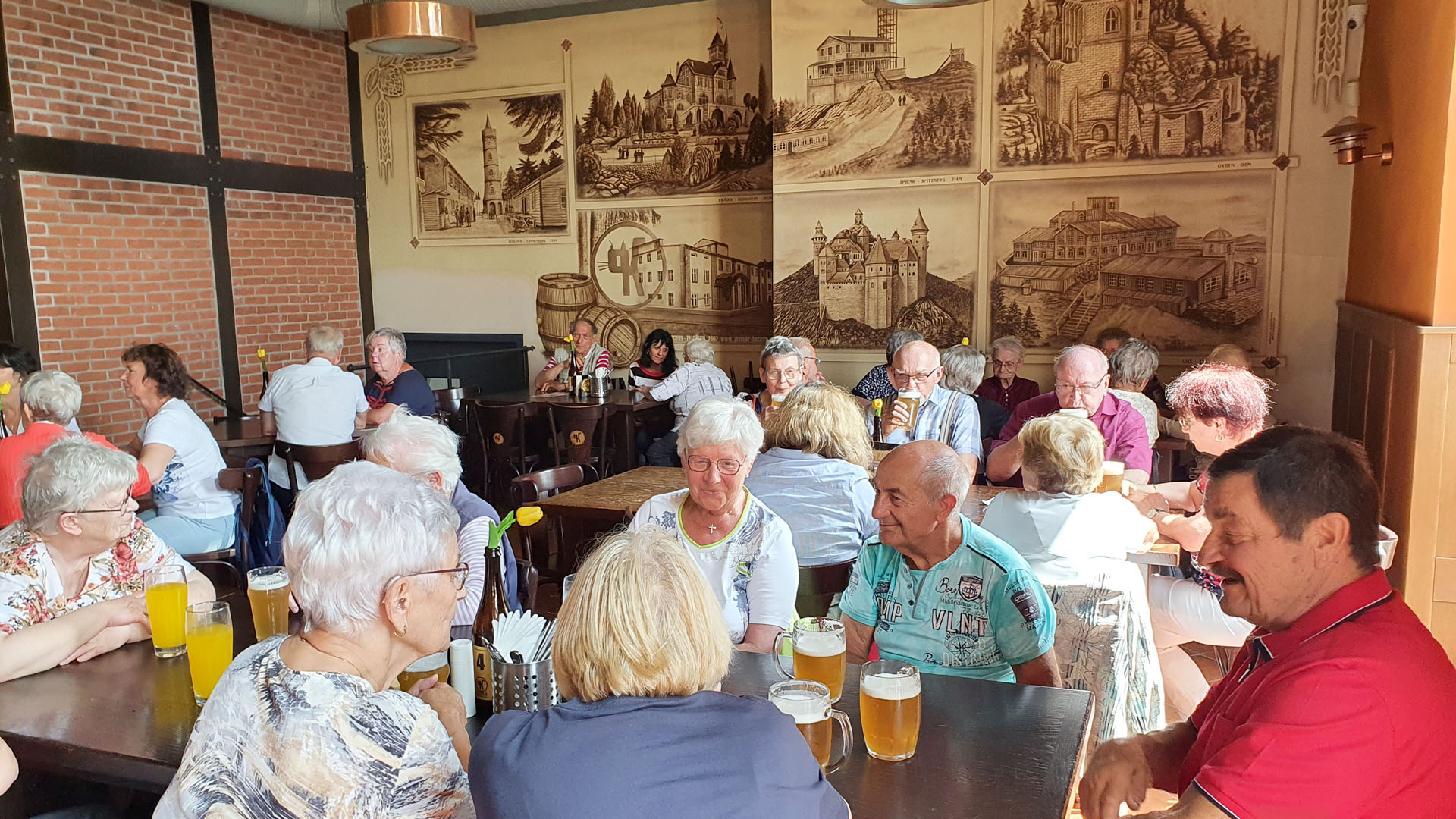 Das Mittagessen wurde in der Brauerei Kocour (Schwarzer Kater) in Varnsdorf, direkt an der deutsch-tschechischen Landesgrenze, serviert. Die Brauerei bietet eine breite Bierauswahl an. Zum Brauereikomplex gehört neben dem Restaurant auch ein kleiner Zoo, in dem nicht nur Bauernhof-, sondern auch viele andere Tiere zu sehen sind. Ebenso verfügt die Brauerei über einen eigenen Erlebnis-Bahnhof mit Haltestelle, die einzige in Tschechien. Nach einem Gottesdienst in der dortigen katholischen Kirche St. Peter und Paul fuhr die Reisegruppe nach Leutersdorf weiter. In der Gemeinde Mariä Himmelfahrt angekommen, gab es für alle Kaffee und Kuchen zum Vesper. Dieses freudige Wiedersehen war ebenfalls eine gute Gelegenheit, um sich gegenseitig über aktuelle Neuigkeiten in den beteiligen Gemeinden auszutauschen. Gut gestärkt, brach der Reisebus schließlich gegen 16:30 Uhr zur Heimfahrt auf. Damit ging auch dieser abwechslungsreiche Juni-Ausflug zu Ende.