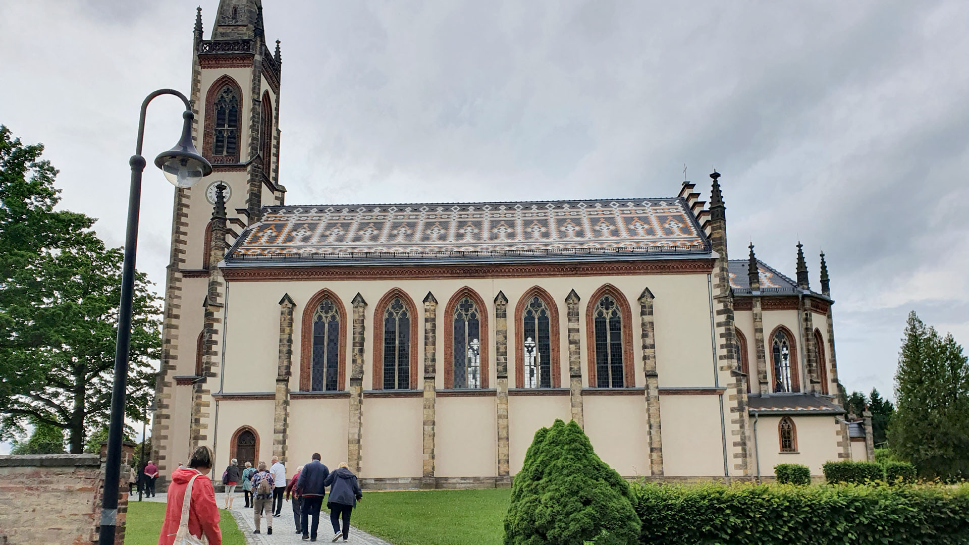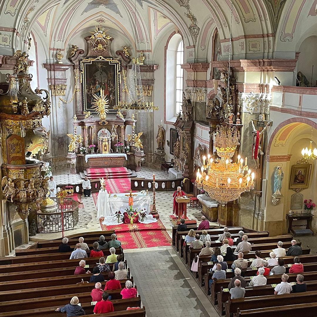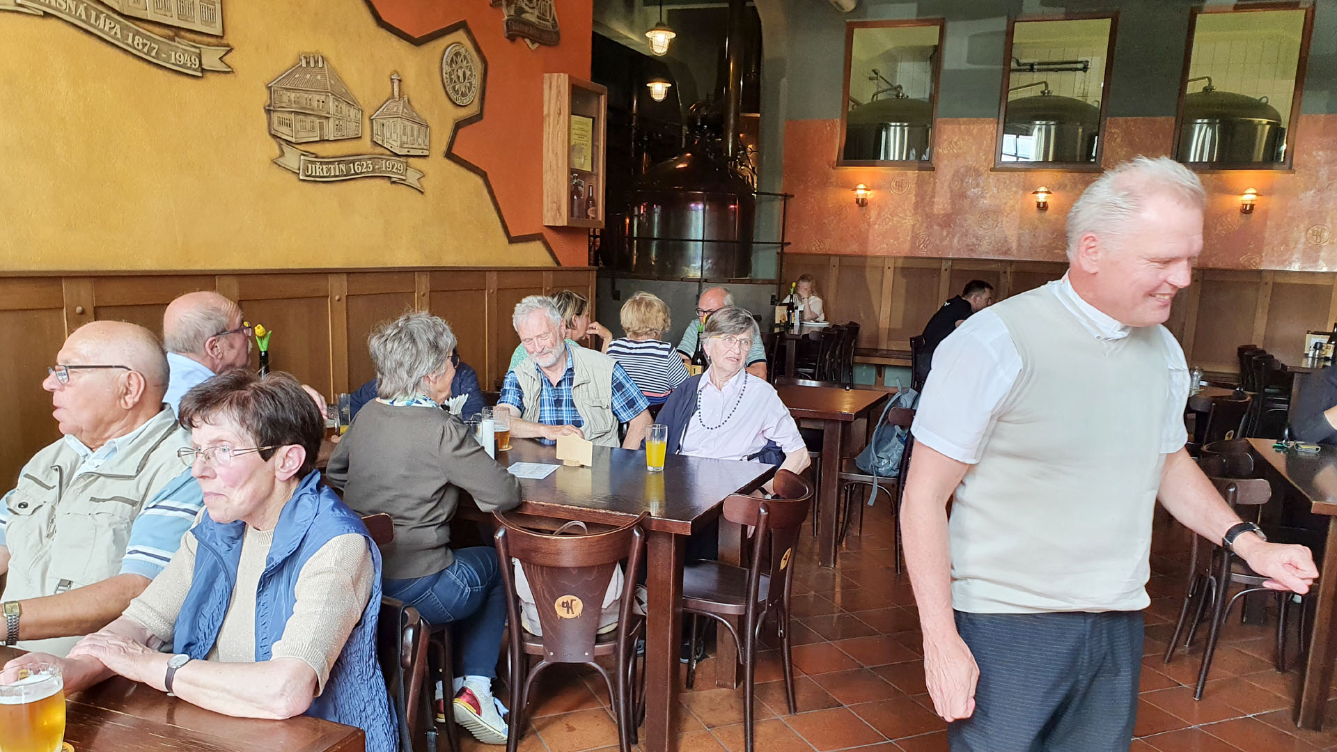 Das Mittagessen wurde in der Brauerei Kocour (Schwarzer Kater) in Varnsdorf, direkt an der deutsch-tschechischen Landesgrenze, serviert. Die Brauerei bietet eine breite Bierauswahl an. Zum Brauereikomplex gehört neben dem Restaurant auch ein kleiner Zoo, in dem nicht nur Bauernhof-, sondern auch viele andere Tiere zu sehen sind. Ebenso verfügt die Brauerei über einen eigenen Erlebnis-Bahnhof mit Haltestelle, die einzige in Tschechien. Nach einem Gottesdienst in der dortigen katholischen Kirche St. Peter und Paul fuhr die Reisegruppe nach Leutersdorf weiter. In der Gemeinde Mariä Himmelfahrt angekommen, gab es für alle Kaffee und Kuchen zum Vesper. Dieses freudige Wiedersehen war ebenfalls eine gute Gelegenheit, um sich gegenseitig über aktuelle Neuigkeiten in den beteiligen Gemeinden auszutauschen. Gut gestärkt, brach der Reisebus schließlich gegen 16:30 Uhr zur Heimfahrt auf. Damit ging auch dieser abwechslungsreiche Juni-Ausflug zu Ende.