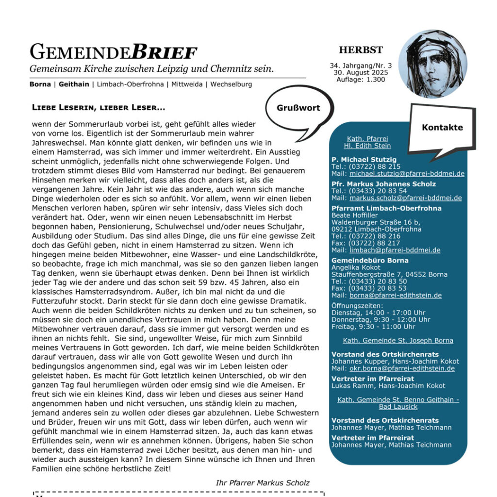 Borna/Geithain (31.08.2025). Mit dem erwarteten Beginn der Herbstzeit erscheint ein einfacher GemeindeBrief für alle katholischen Haushalte der Gemeinden St. Joseph Borna und St. Benno Geithain – Bad Lausick. Er informiert über die Termine für die Gräbersegnungen sowie einige Veranstaltungen und digitale Angebote: www.pfarrei-edithstein.de/dl_borna/gemeindebrief_ausdrucken.pdf