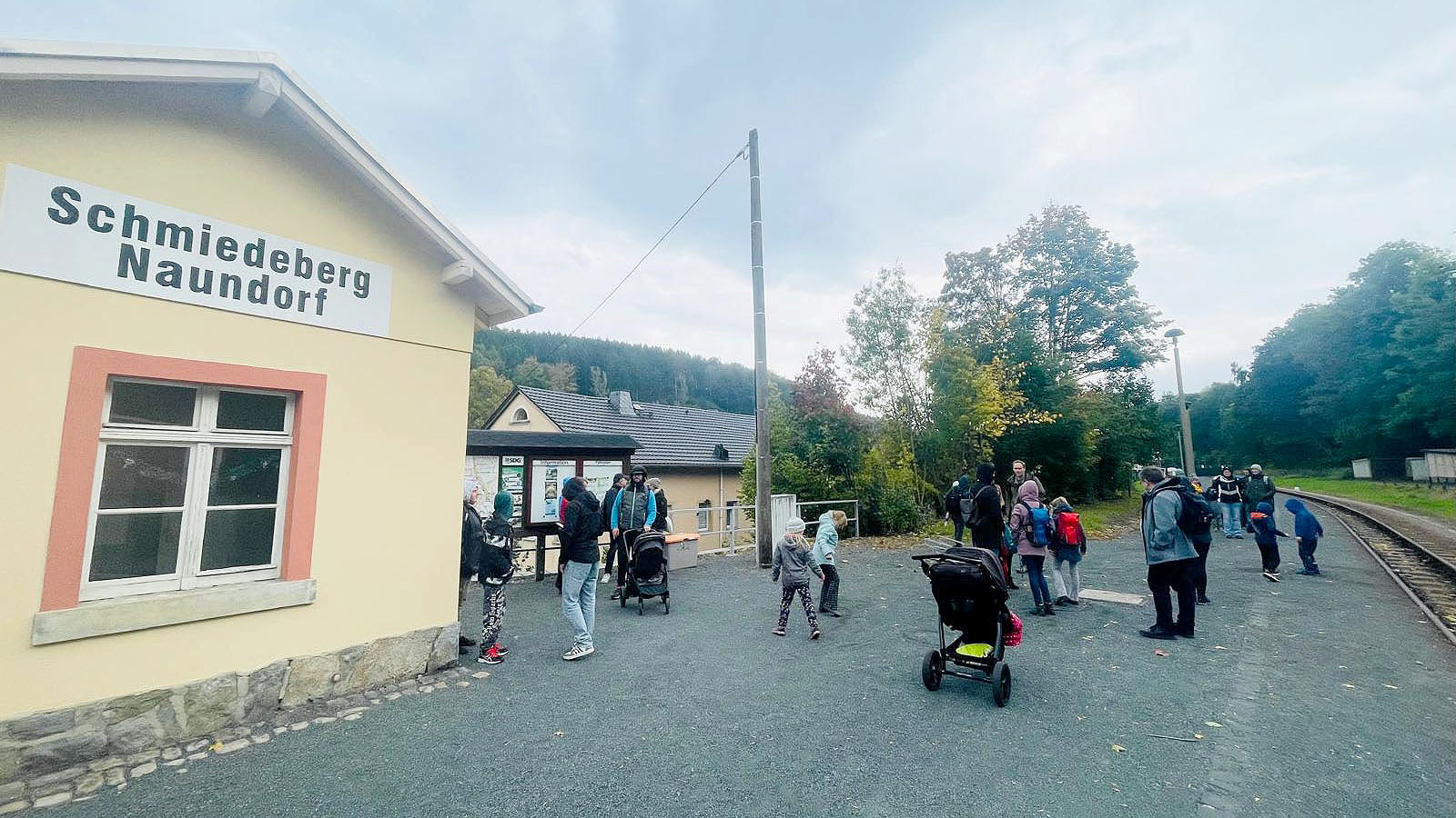 Der Herbst hielt das Familienwochenende fest in seinem Griff, Wind und Regen wechselten sich ab. Dennoch unternahm die Gruppe am Nachmittag einen Ausflug mit der Weißeritztalbahn, einer Schmalspurbahn, nach Kipsdorf. Den Rückweg nach Schmiedeberg konnte, wegen des Wetters, jeder individuell gestalten: Direkt mit der Bahn, als Wanderung entlang der Roten Weißeritz oder nach dem Vesper in einem Café in Nachbarschaft zum Bahnhof als kurzer Wanderweg mit Busfahrt.
