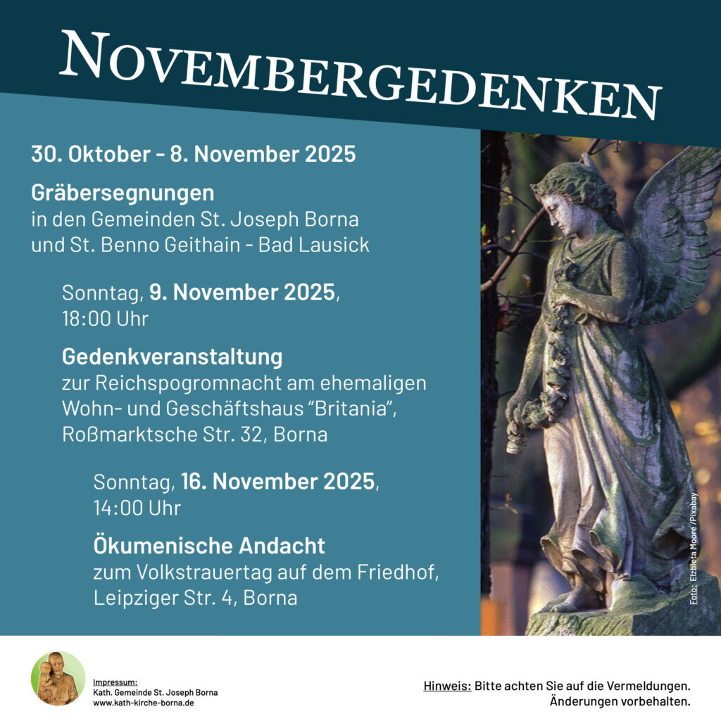 Ökumenischen Andacht zum Volkstrauertag am Sonntag, dem 16. November 2025, um 14:00 Uhr auf dem Friedhof, Leipziger Str. 4, in Borna. Das ehrende Gedenken findet in Anwesenheit von Oberbürgermeister Oliver Urban und Vertretern von evangelisch-lutherischer und katholischer Kirche statt.