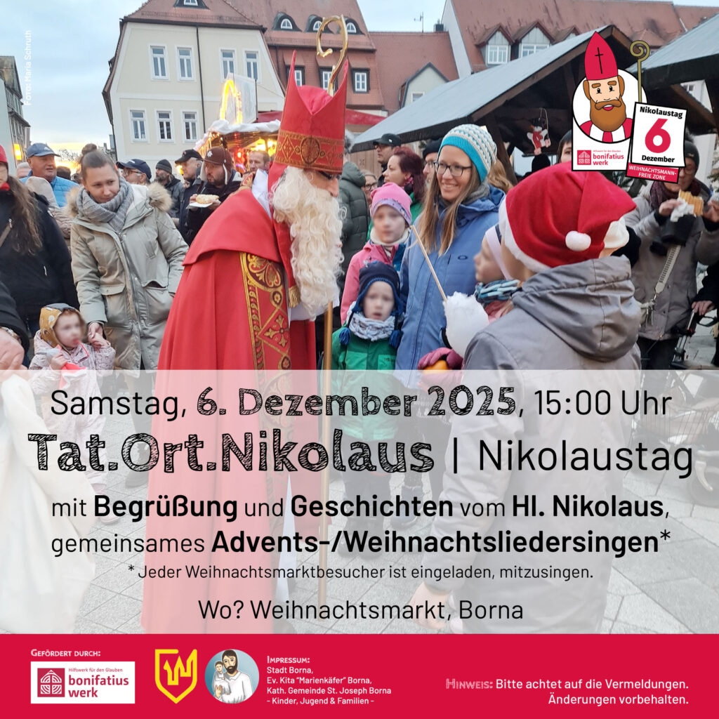 Die Aktion „Tat.Ort.Nikolaus“ gehört zur bundesweit bekannten Initiative „Weihnachtsmannfreie Zone“, die das Bonifatiuswerk im Jahr 2002 ins Leben gerufen hat, um den Hl. Nikolaus mit seinen christlichen Werten wie Gerechtigkeit, Nächstenliebe und Hilfsbereitschaft wieder mehr in den Fokus der Gesellschaft zu rücken. Das Hilfswerk fördert den Nikolaus-Besuch auf dem Bornaer Weihnachtsmarkt u.a. mit 200 Schokonikoläusen.