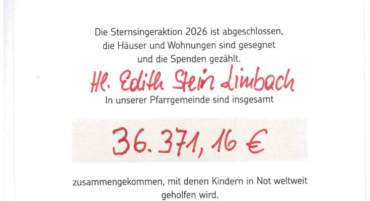 DIe Sternsinger-Aktion in unserer Pfarrei ist abgeschlossen, viele Häuser, Wohnungen, Kindergärten, Schulen, Pflege- und Altenheime und Rathäuser sind von unseren Sternsinger besucht worden und der Segen gebracht worden.