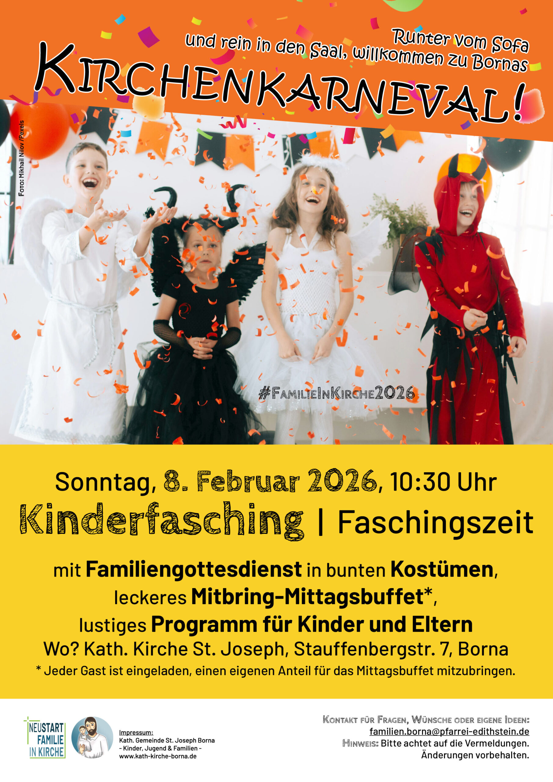 Familiengottesdienst in bunten Kostümen, anschl. Kinderfasching mit leckerem Mitbring-Mittagsbuffet, lustigem Programm für Kinder und Eltern