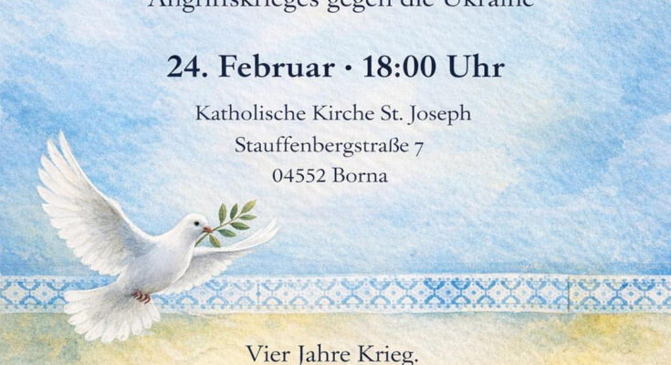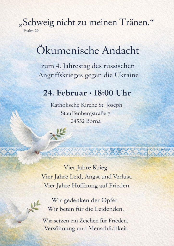 Ökumenischen Friedensgebet anlässlich des 4. Jahrestages des russischen Angriffskrieges gegen die Ukraine am Dienstag, dem 24. Februar 2026, um 18:00 Uhr in der katholischen Kirche St. Joseph in Borna.