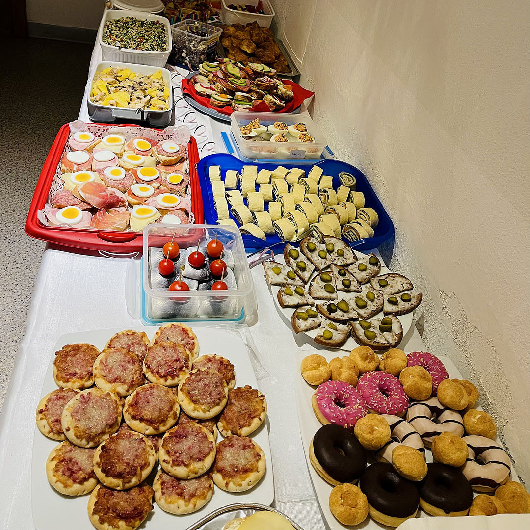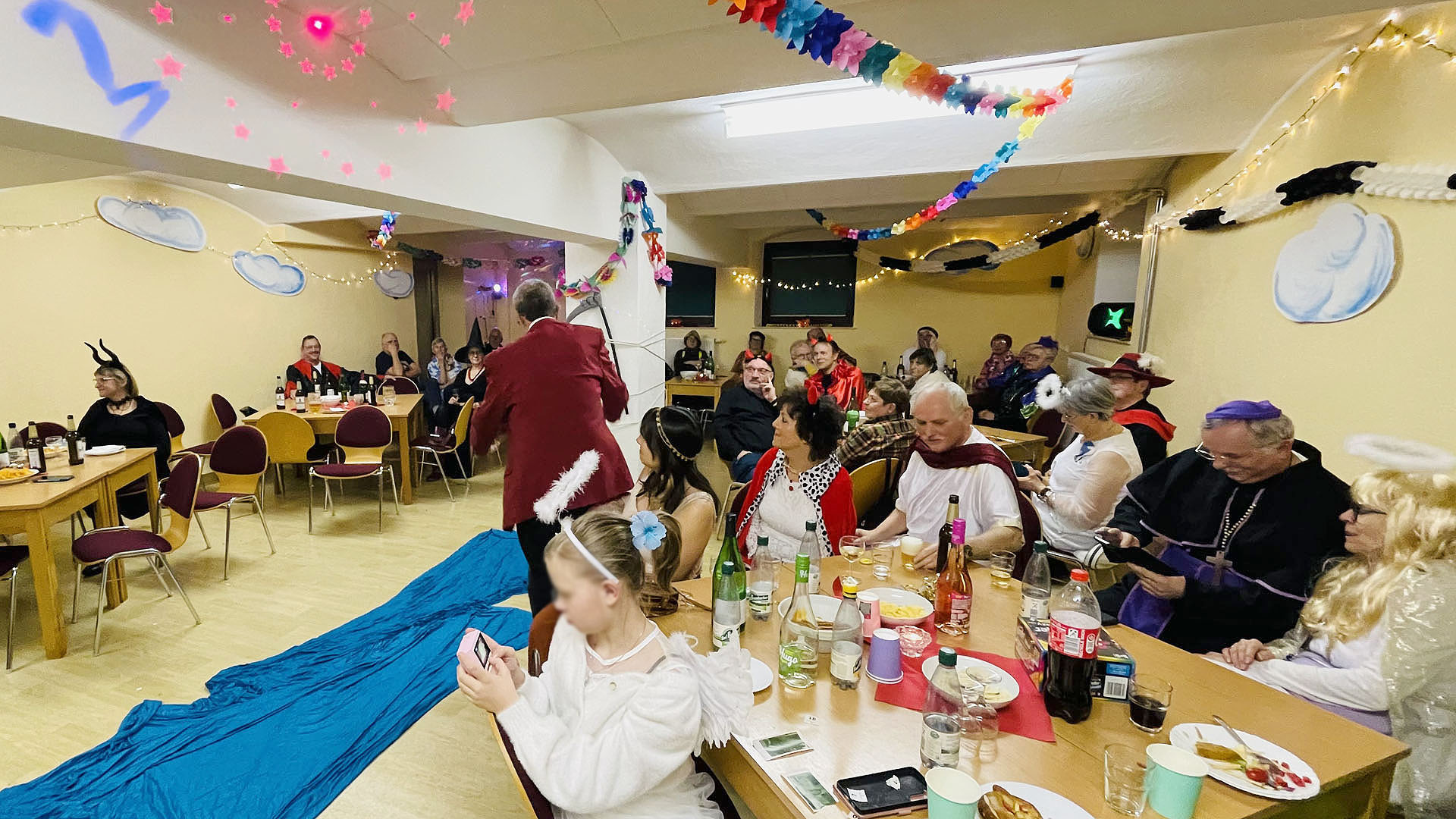 Der diesjährigen Einladung unter dem Motto „Zwischen Himmel und Hölle“ waren am Samstagabend etwa 60 Vertreter der himmlischen und höllischen Heerscharen in die Gemeindesäle gefolgt. Darunter allerlei Engel und Teufel, ein Bischof sowie eine „heilige“ Kuh. Diese fanden an einem himmlisch-leckeren Mitbring-Buffet, an dem sich alle Gäste beteiligten, eine große Auswahl an Speis & Trank, um sich für ein höllisch-gutes Faschingsprogramm zu stärken.