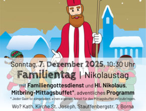 Herzliche Einladung zum… Nikolaustag am Sonntag, dem 7. Dezember 2025, in der katholischen Kirche St. Joseph in Borna. Programm: * 10:30 Uhr, Familiengottesdienst mit dem Hl. Nikolaus * anschl. Familientag …