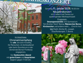 Herzliche Einladung zum… Neujahrskonzert mit Liedern und Texten zur ausklingenden Weihnachtszeit am Sonntag, dem 11. Januar 2026, um 16:00 Uhr in der katholischen Kirche St. Joseph in Borna. Programm: * …